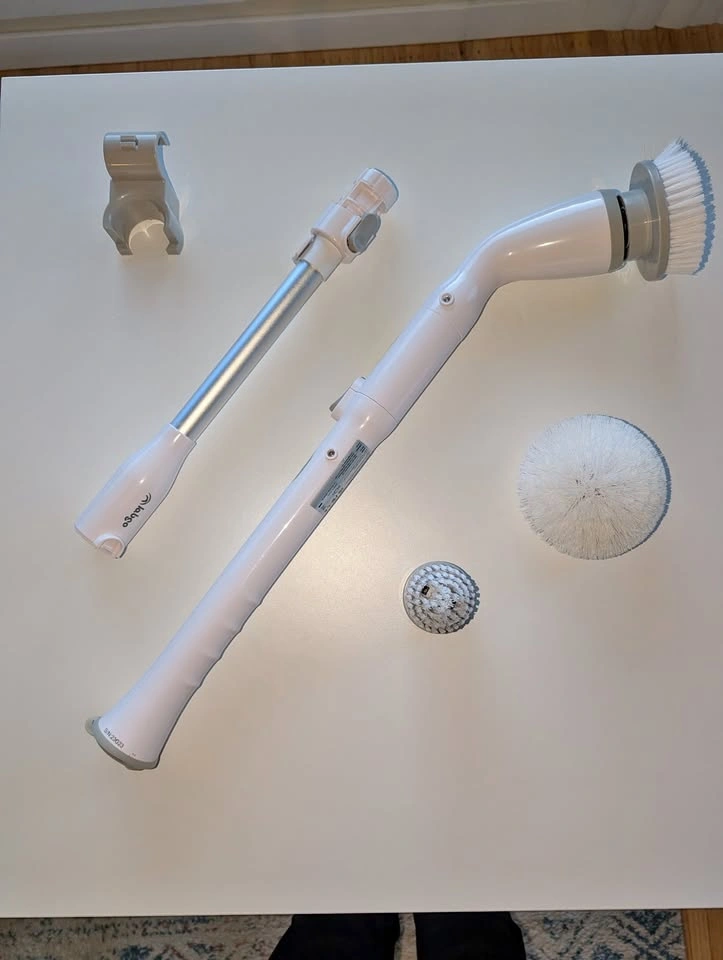 Comes with 3 different replaceable brush heads, charger and an attachment for hanging the scrubber