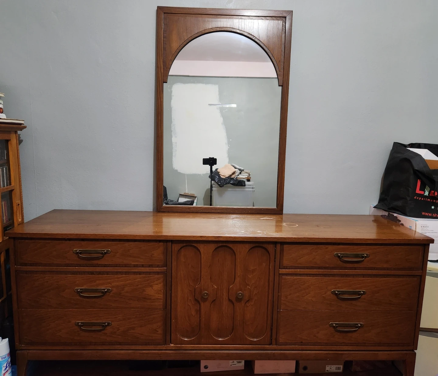 Selling a Harmony House vintage bedroom set. The set includes a tall dresser, a long dresser with mirror, and two nightstands. All pieces are made of wood and have a beautiful, classic design. Perfect for adding a touch of vintage charm to your bedroom!