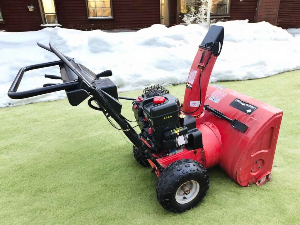 Features: The snowblower has large X-trac tires for traction, a manual chute control