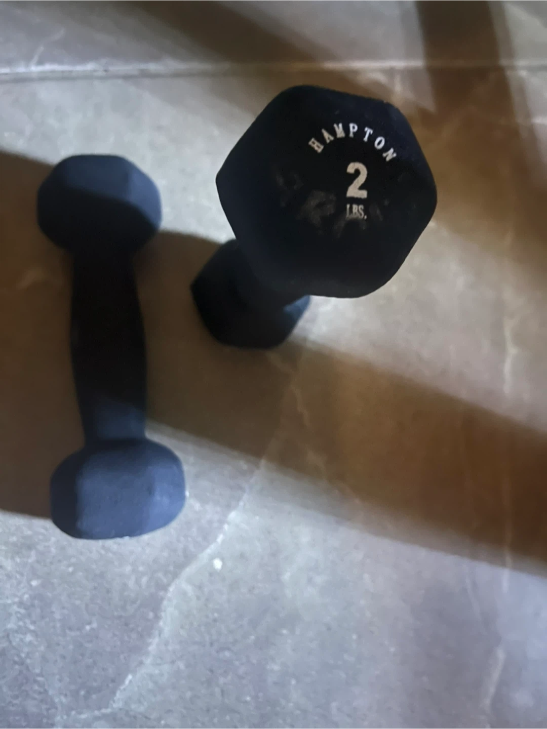 Selling a pair of Hampton 2 lbs dumbbells. Black rubber hex shape. They are in good condition and ready for your home workout routine.