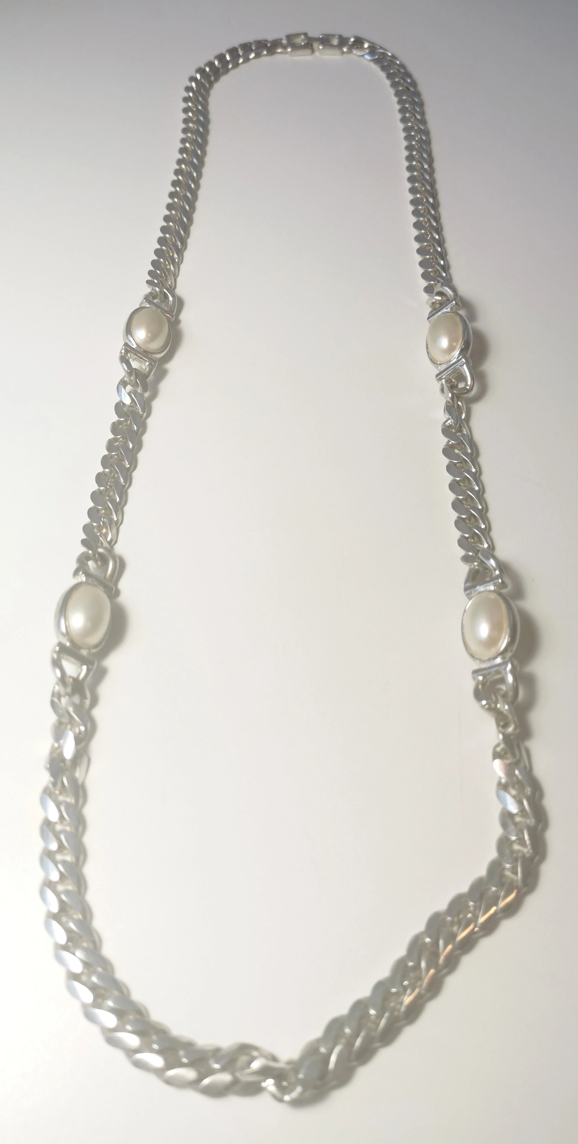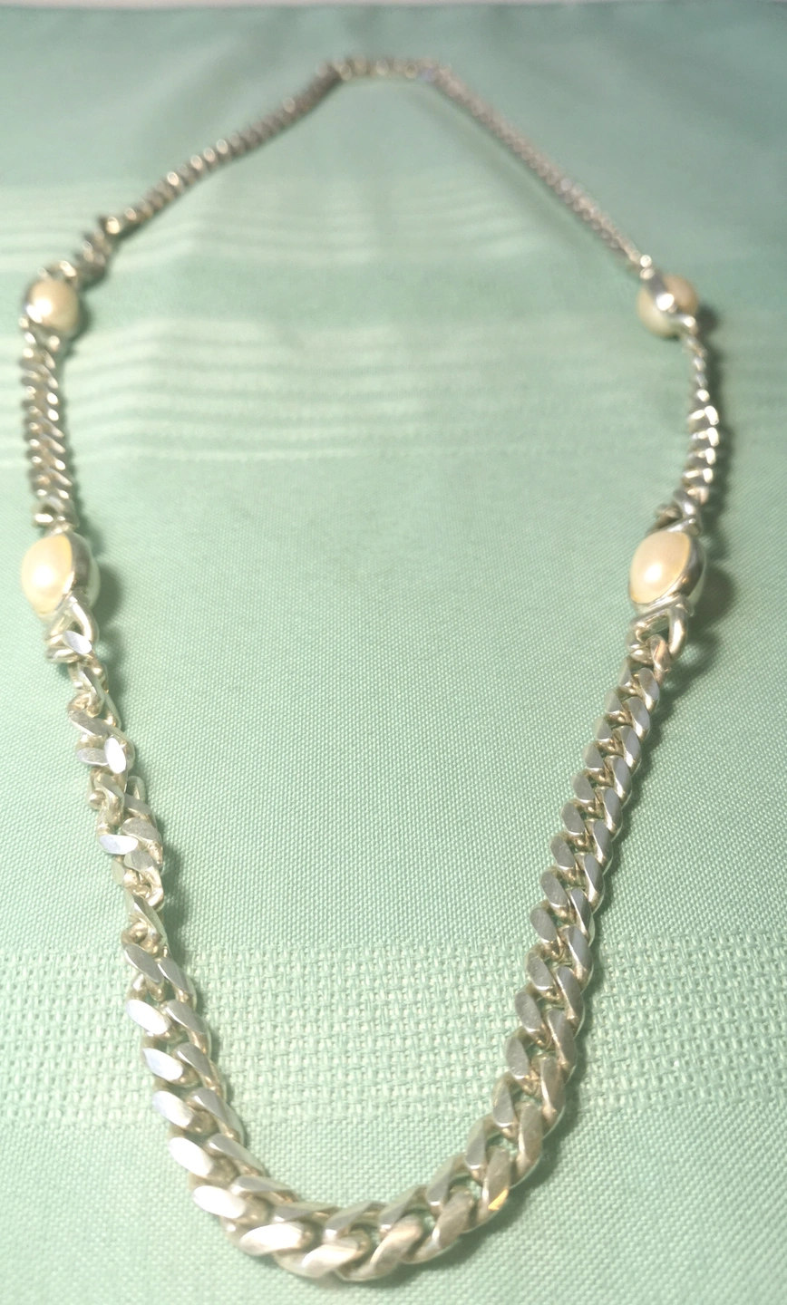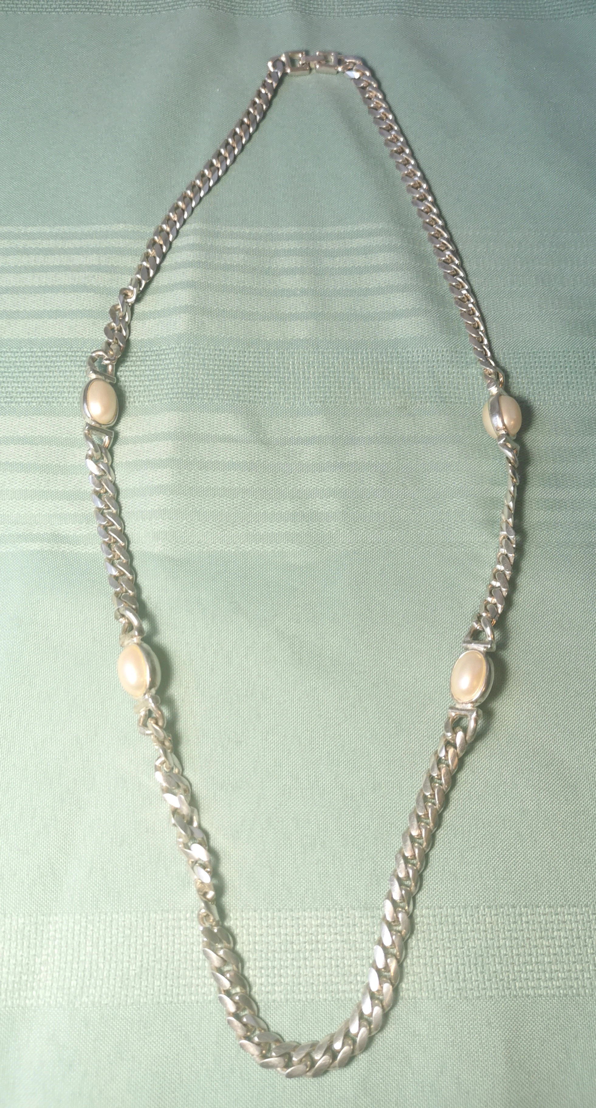 This vintage 80s-style necklace features a silver tone chain with faux pearl stations, creating a classic and elegant look.