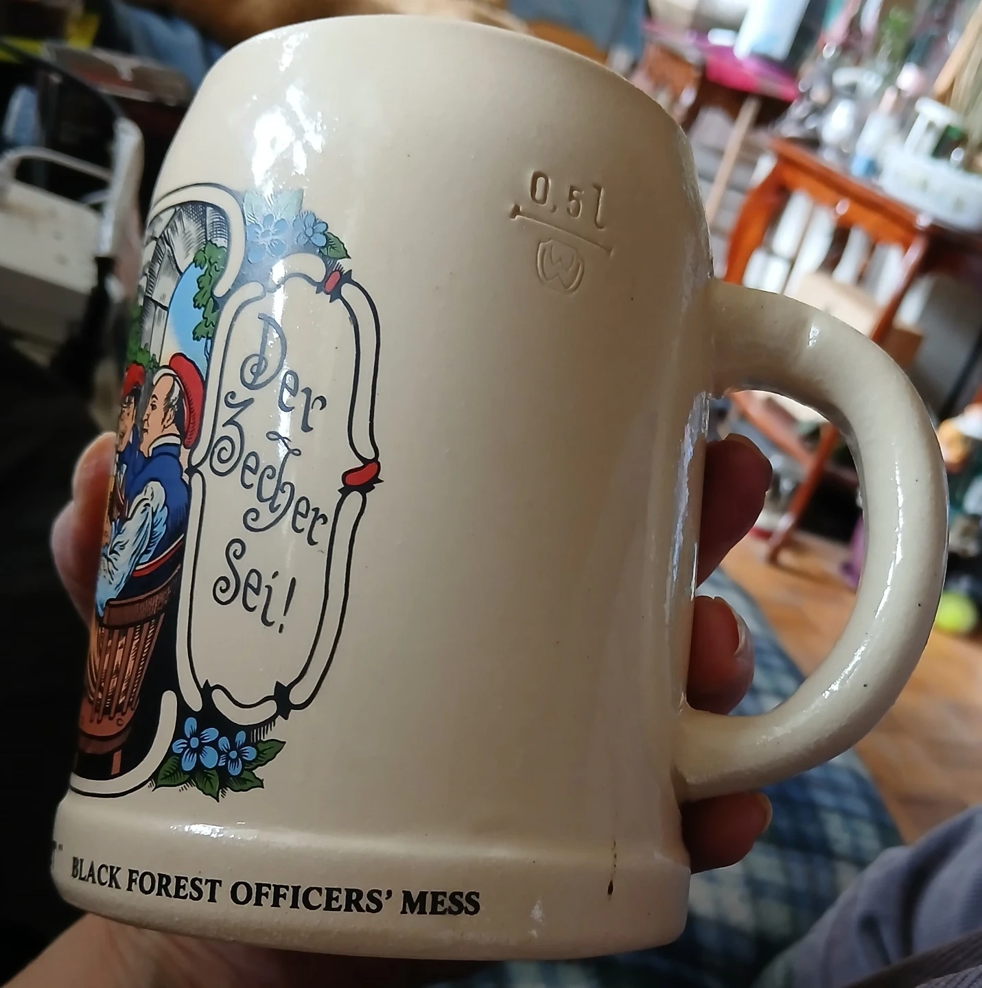 Selling a charming Hugo Schmidt beer stein, perfect for Oktoberfest celebrations or adding a touch of German tradition to your home! The stein features colourful illustrations and inscriptions in German, including 'Froh und Frei' and 'Der Becher Sei!' It also says 'Black Forest Officers' Mess' and 'Oktoberfest'. A unique piece for collectors or beer enthusiasts
