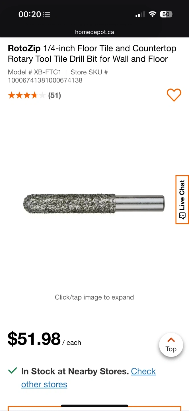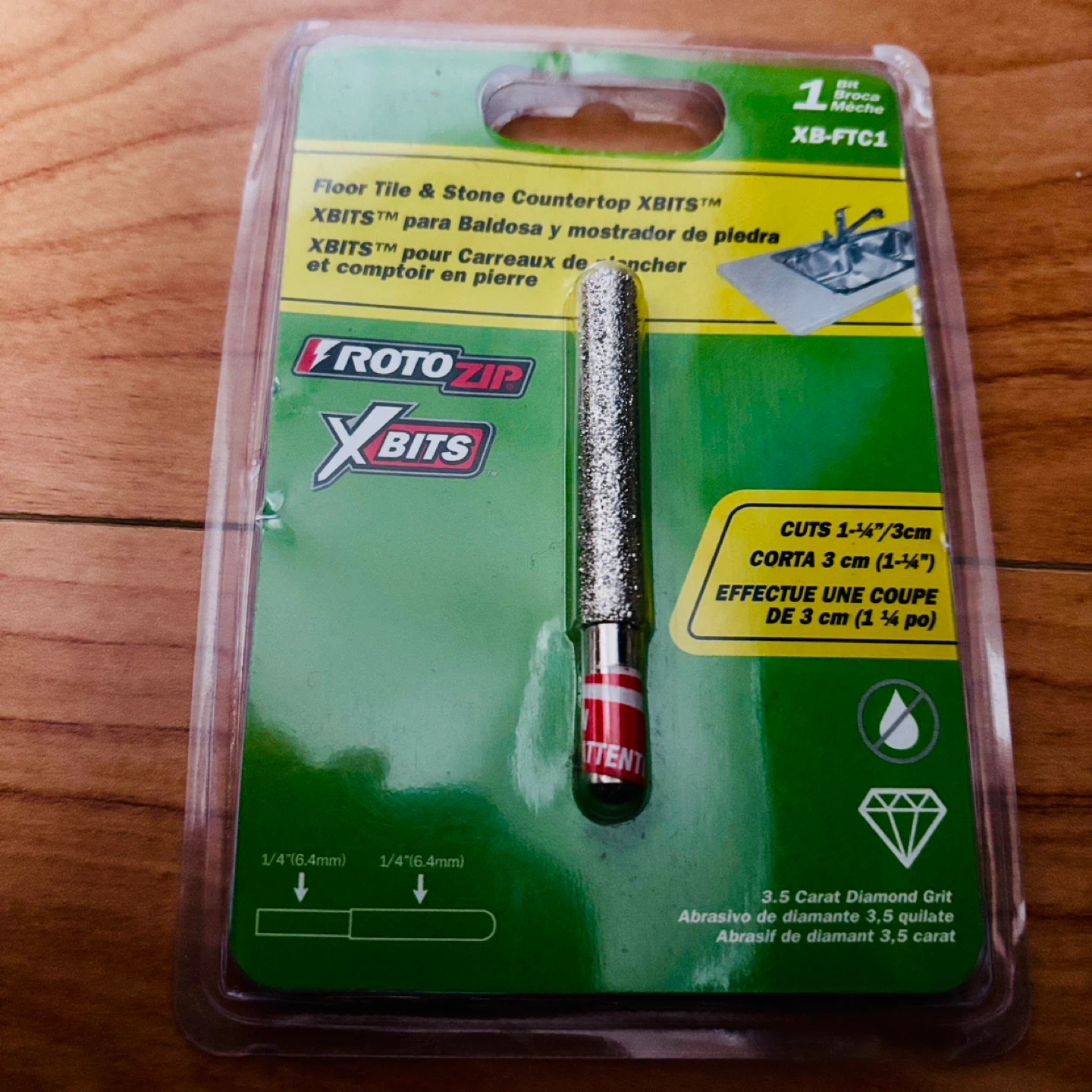 Selling a RotoZip 1/4-inch floor tile and stone countertop rotary tool drill bit. It's the XB-FTC1 model and it's brand new in the packaging. It cuts 3 cm (1-1/4") and has 3.5 Carat Diamond Grit.