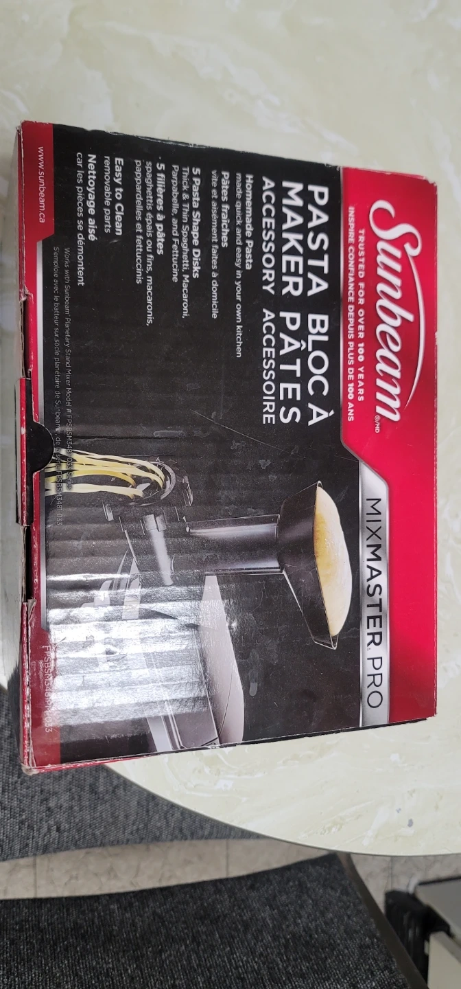 Get ready to make homemade pasta quickly and easily with this Sunbeam Mixmaster Pro Pasta Maker Accessory! It works with Sunbeam planetary stand mixer model # FPSBSM3481-033 series. Features include 5 pasta shape disks for thick & thin spaghetti, macaroni, parpabelle, and fettuccine. It's also easy to clean with removable parts! Box included