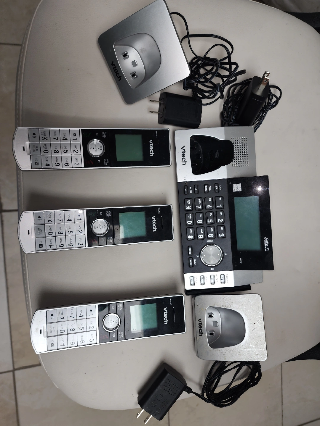 Selling a 3 station VTech cordless phone system. It comes with three handsets and a base station. All are in good working condition and include their chargers