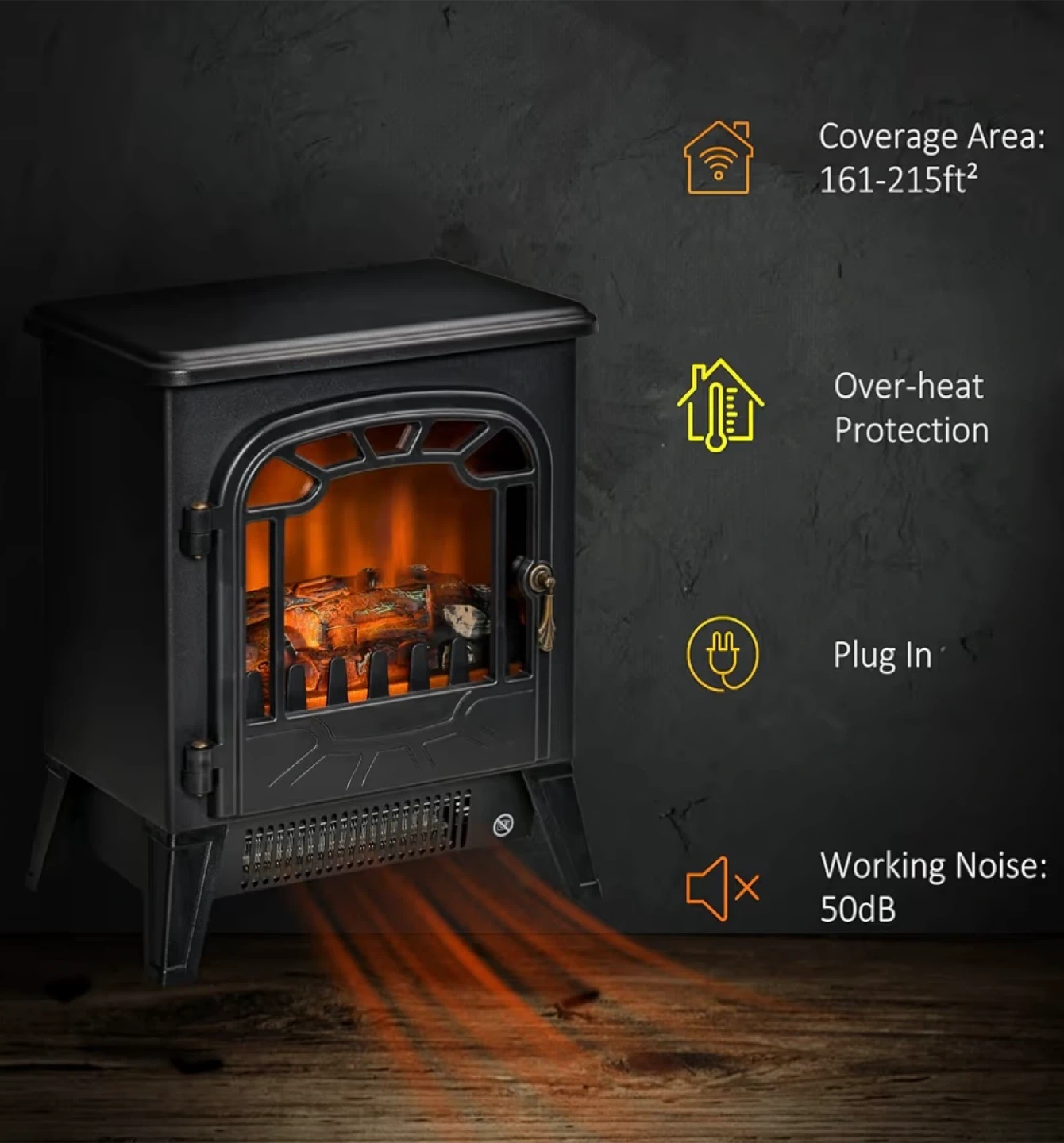 Here's a cute electric fireplace heater! It's in black and would be perfect for adding a cozy touch to any room. It's 16.3 inches (41.5cm) tall, 10 inches (25.5cm) wide, and 14.2 inches (36cm) deep. It also has overheat protection and a working noise of 50dB.