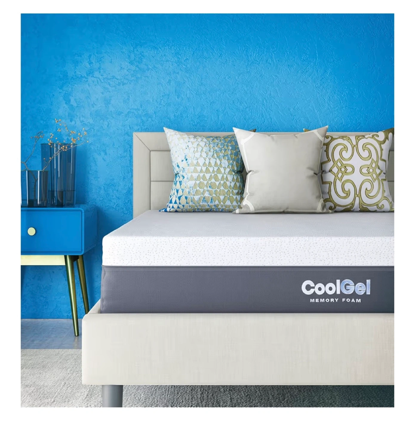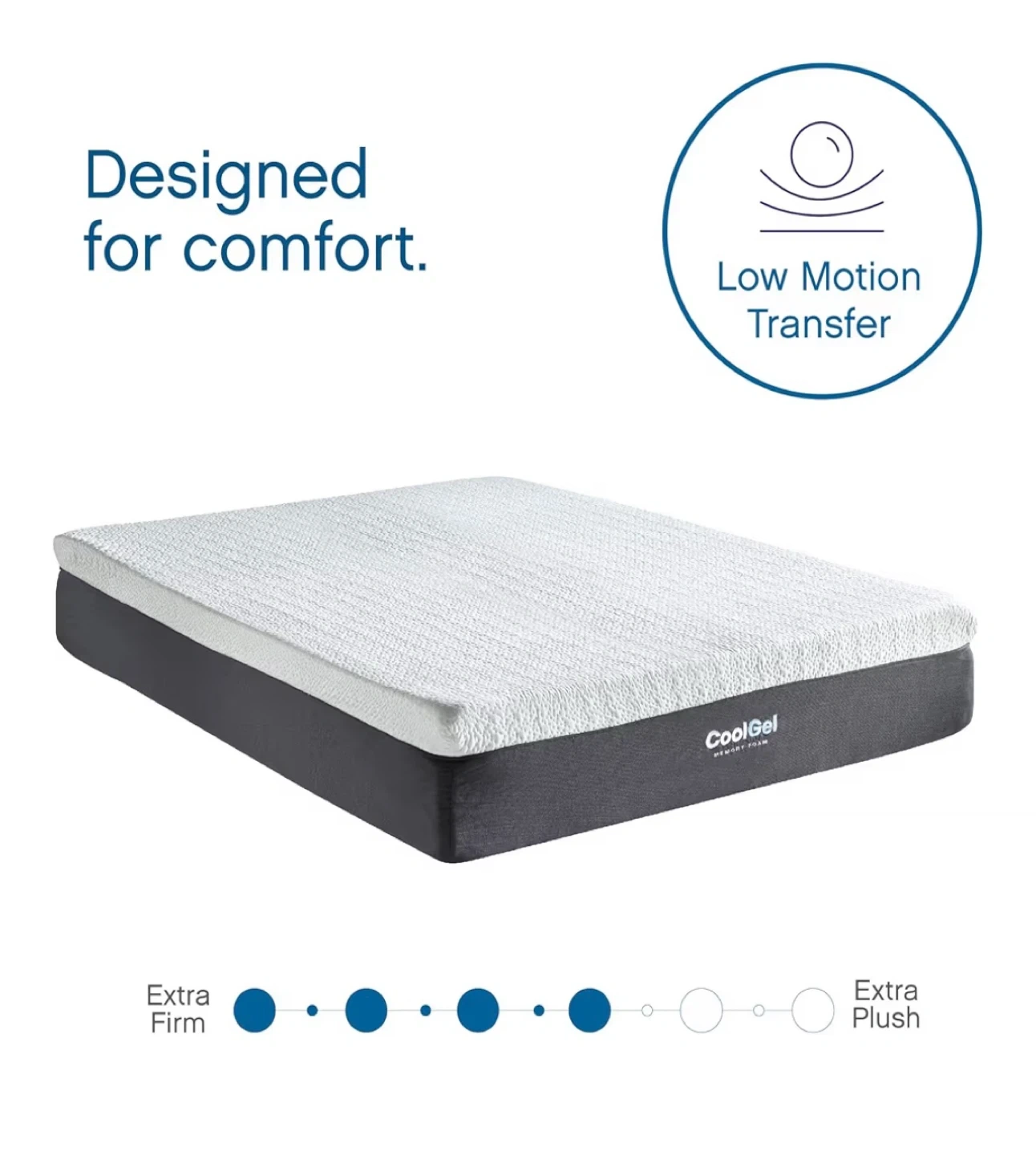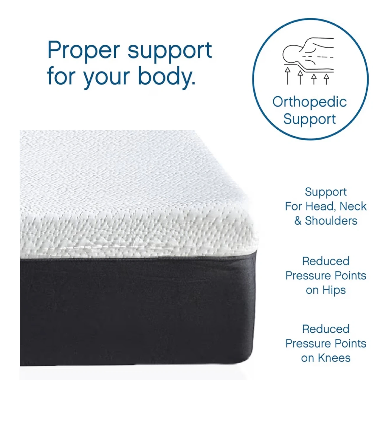 This is a CoolGel Memory Foam mattress designed for comfort and proper support. It features low motion transfer and orthopedic support for your head, neck, and shoulders, reducing pressure points on hips and knees. The mattress has a 12" profile with 2.5" cooling gel memory foam, 3.5" supportive poly foam, and 6" high-density base foam.