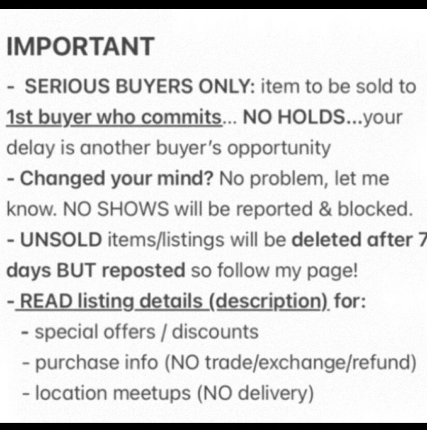 SERIOUS BUYERS ONLY / FINAL SALE / Cash Payment at pickup / NO HOLDS (Items will be sold on a FIRST-COME/PAYMENT-FIRST-SERVE basis!)