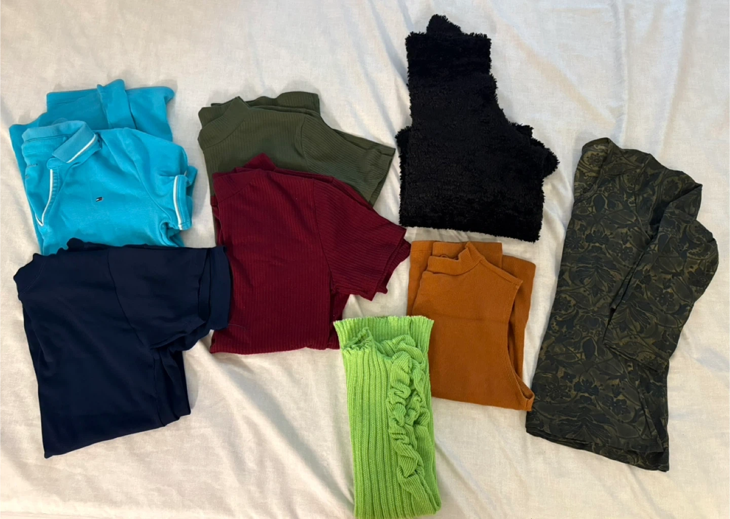 Selling a collection of women's tops in various colours and styles. Includes a Tommy Hilfiger polo shirt, ribbed turtlenecks, and other unique pieces. Total of 8 itens. Perfect for adding variety to your wardrobe!