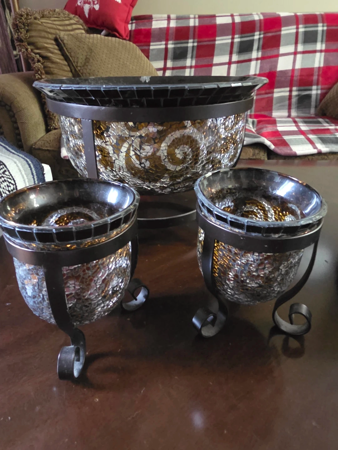A beautiful mosaic glass bowl set that will add a touch of elegance to any room. Includes one large bowl and two smaller bowls, perfect for displaying decorative items or holding candles. The intricate mosaic design catches the light beautifully, creating a warm and inviting atmosphere
