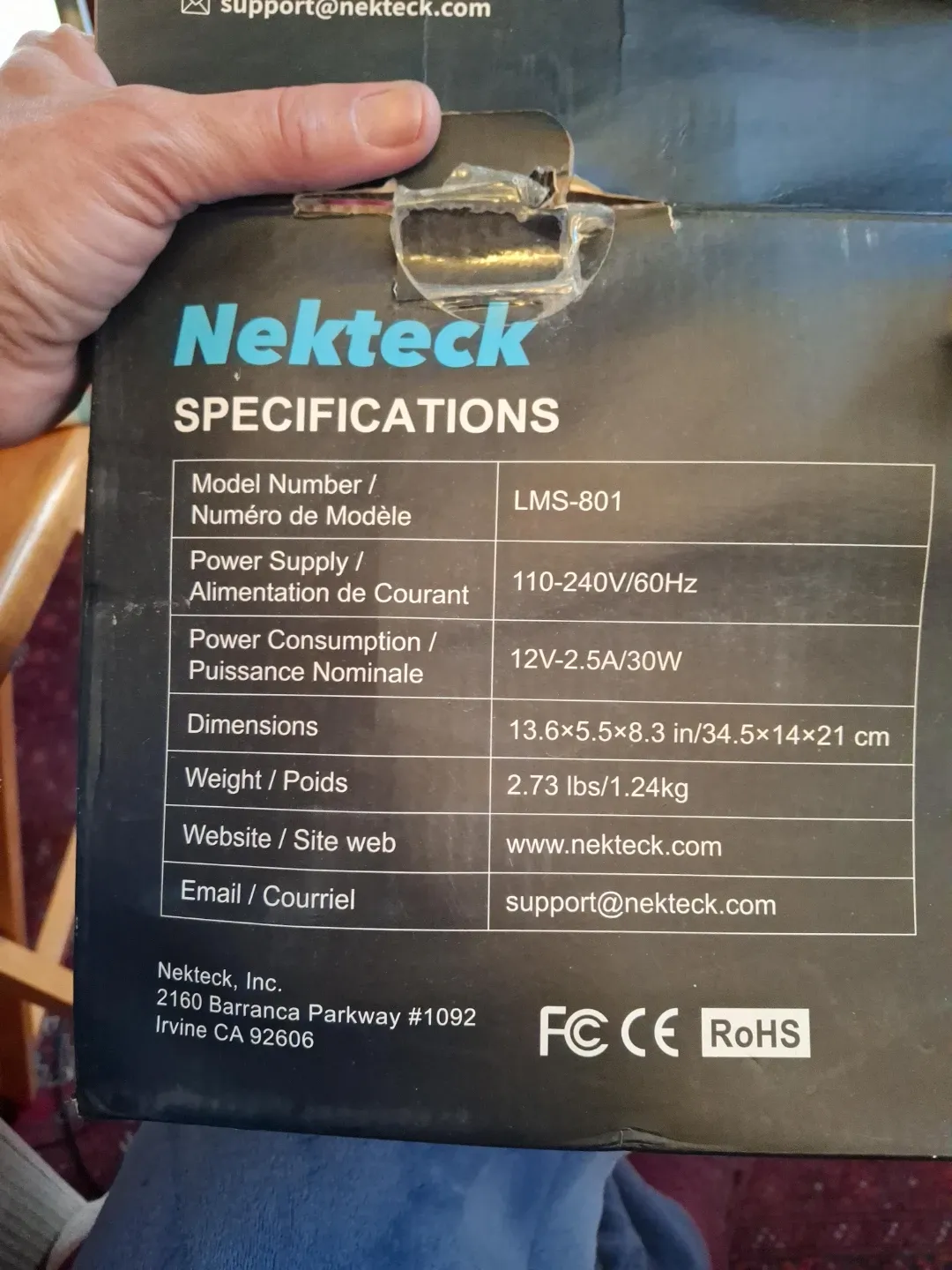 It has a power supply of 110-240V/60Hz and consumes 12V-2.5A/30W. The dimensions are 13.6 x 5.5 x 8.3 inches. It weighs 2.73 lbs. Comes with the original box