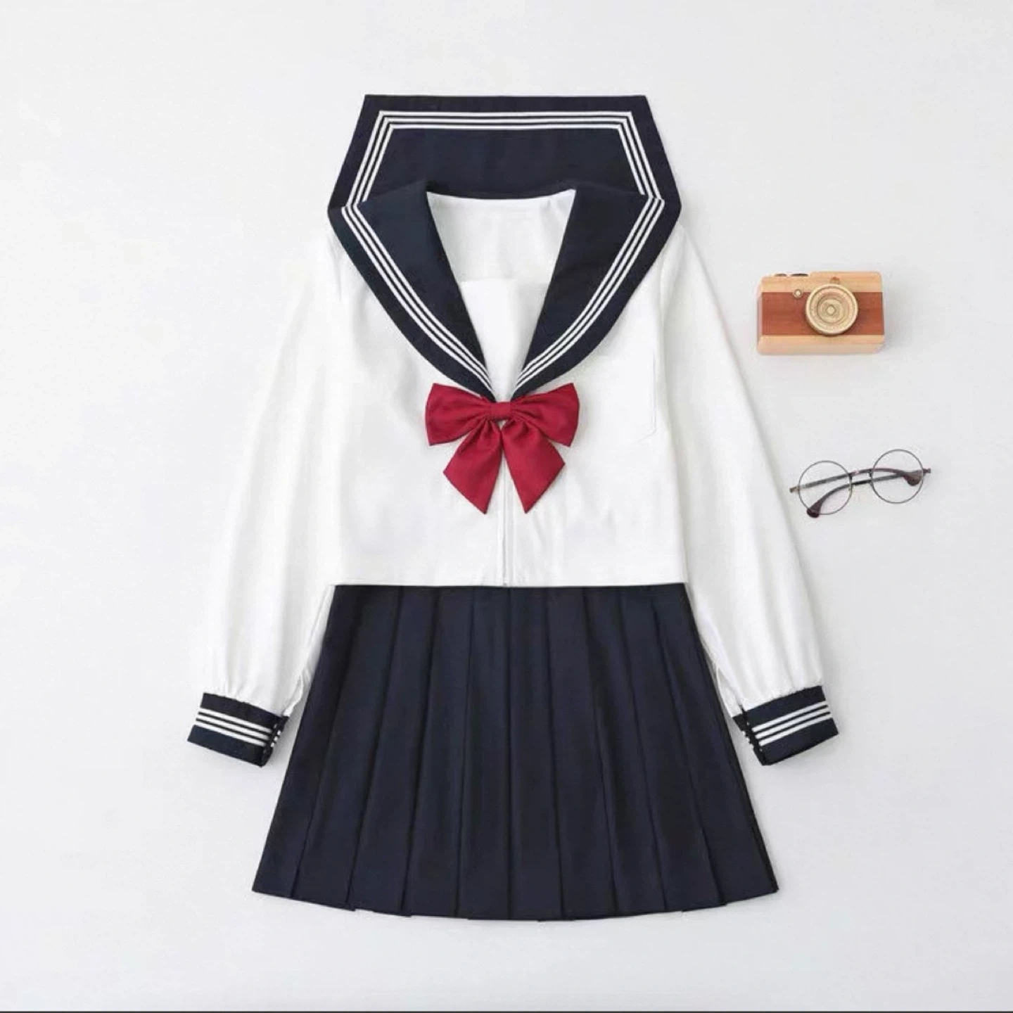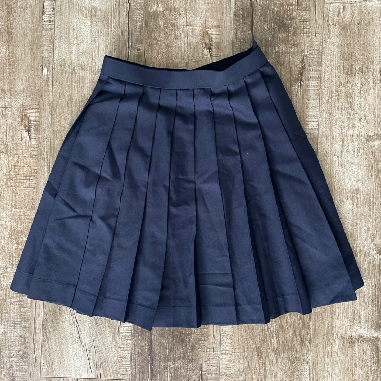 paired with a navy blue pleated skirt (width adjustable)