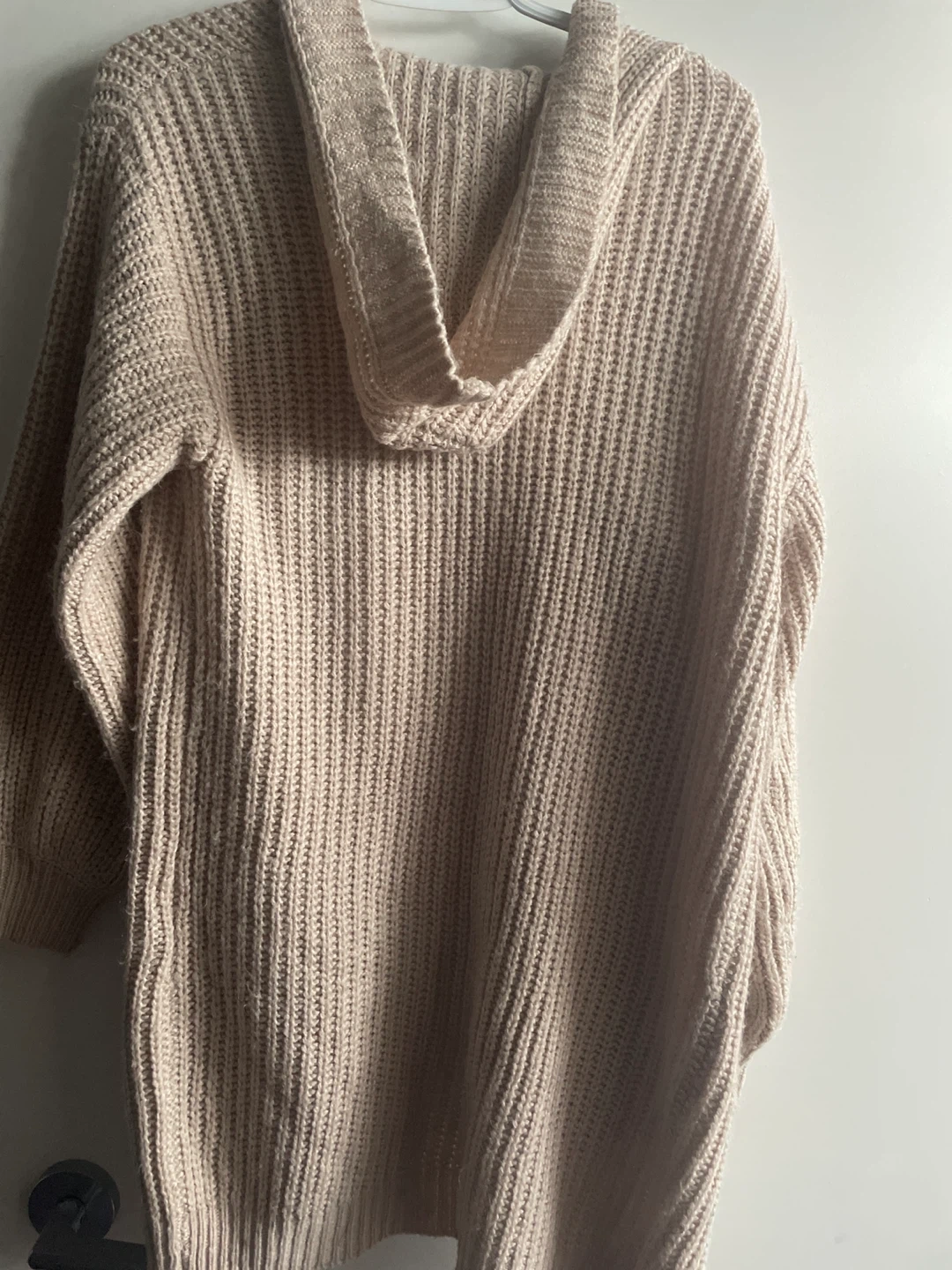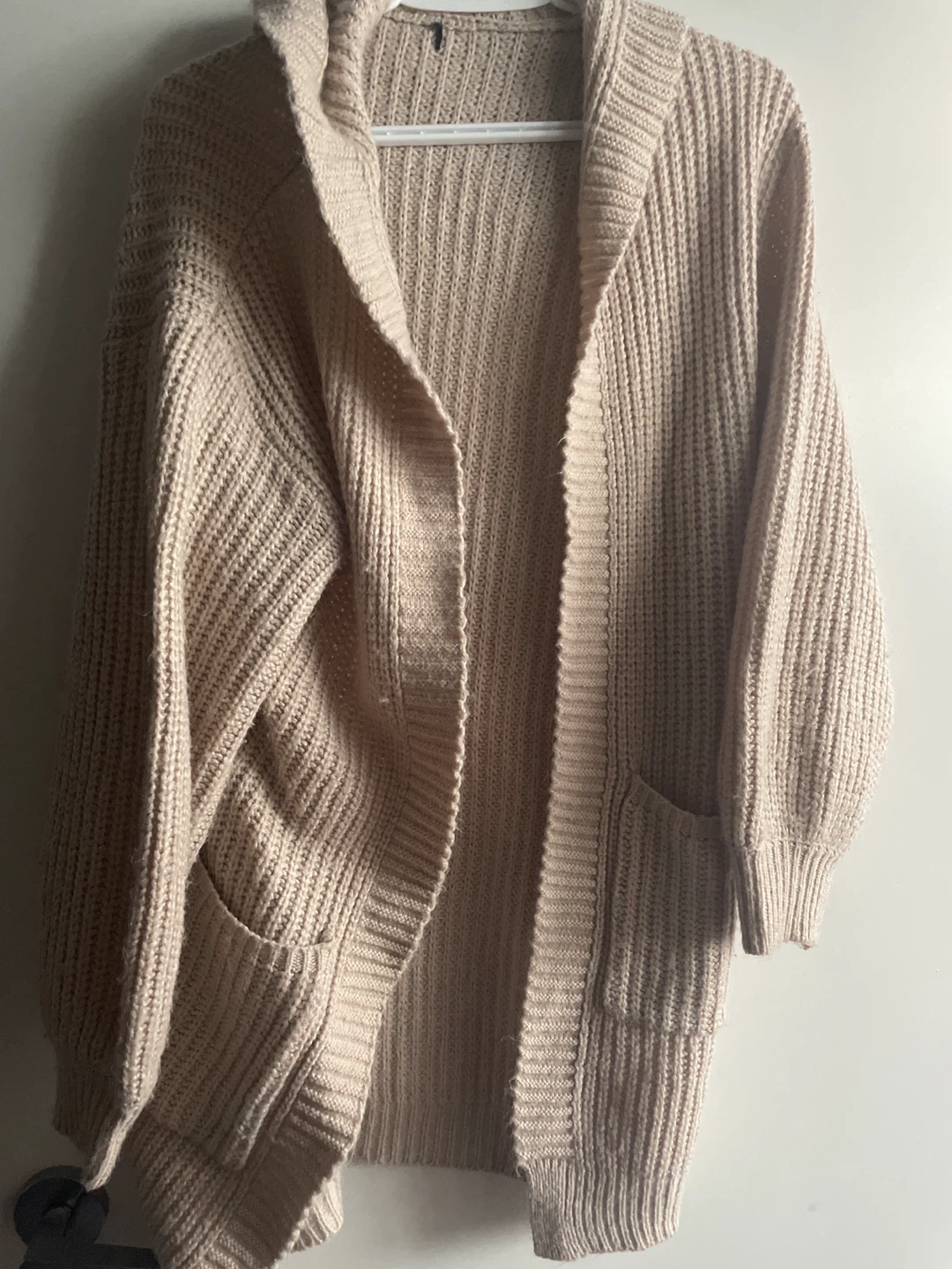 607Cozy up in this lovely beige knit cardigan! It features a hood and pockets, perfect for those chilly days. The material is soft and comfortable, making it a great addition to your wardrobe