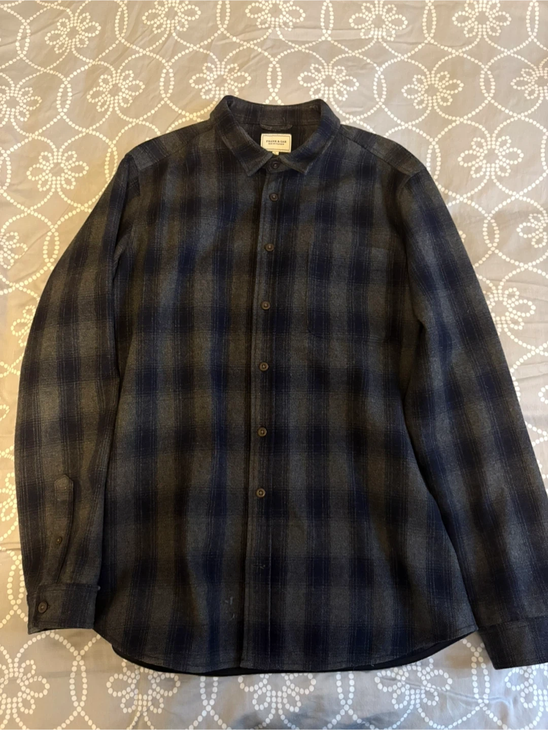 Selling a Frank & Oak Rue St-Viateur flannel shirt in size L. It's in great condition and perfect for layering during the cooler months. The flannel has a nice weight to it and feels really cozy. It's a stylish and comfortable addition to any wardrobe!