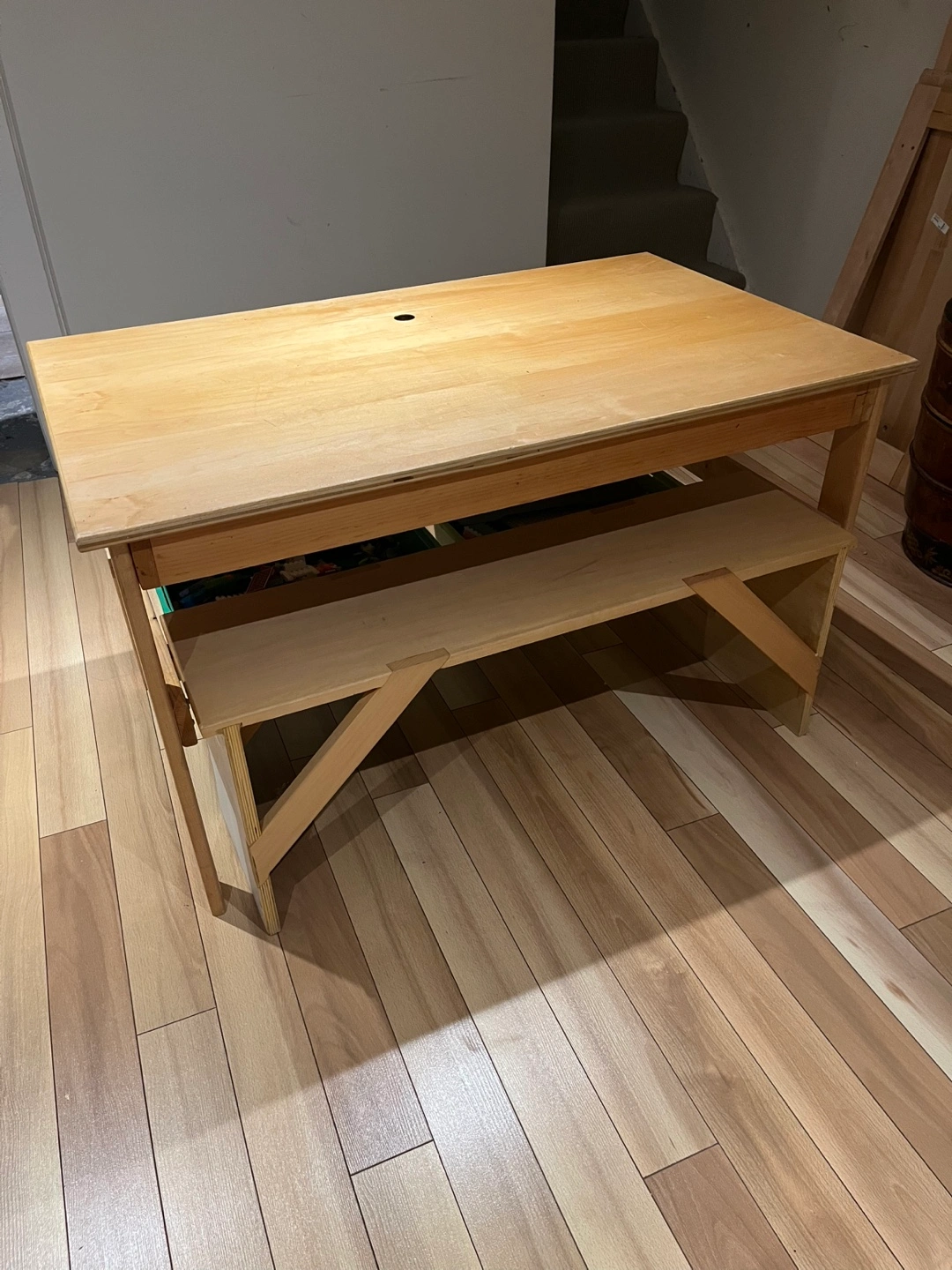 Selling this beautiful Lego/craft table with built in storage and matching bench. Good for little ones aged 2-6. Handmade by my partner who upcycled a door for the top and used solid maple for the legs. Bench tucks under when not in use and we will throw in the two storage bins as well. SFPF Home.