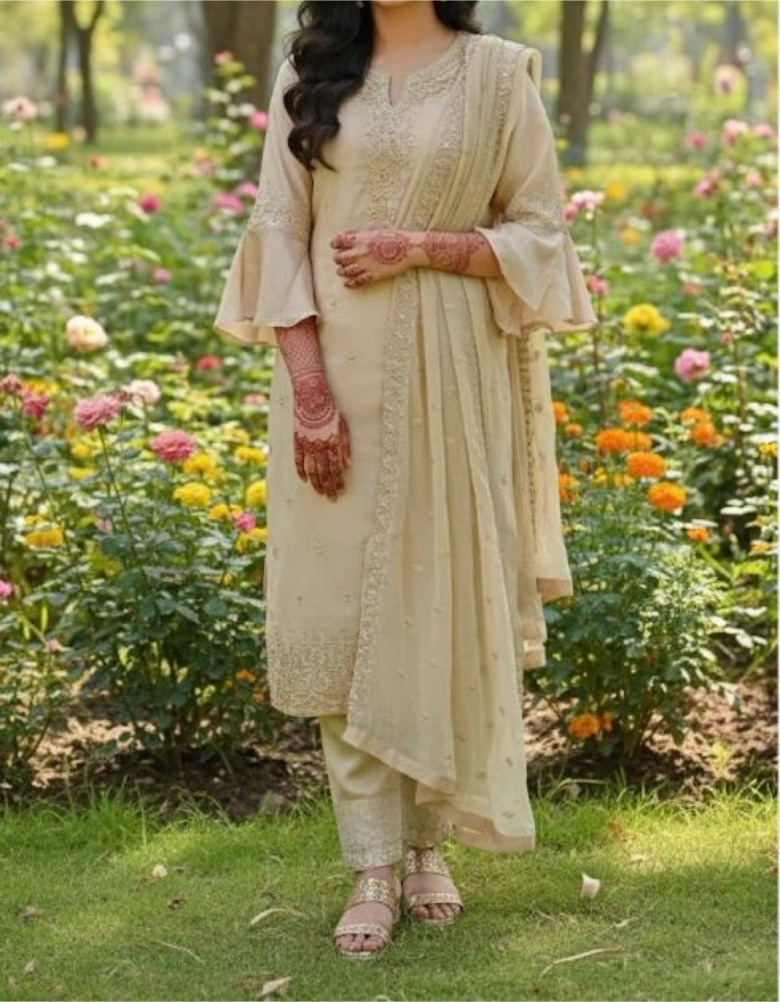 Selling a beautiful beige salwar kameez suit! The fabric looks light and airy, perfect for warmer weather. The sleeves have a lovely bell shape and there's delicate embroidery on the neckline and hem. The dupatta drapes nicely, completing the elegant look