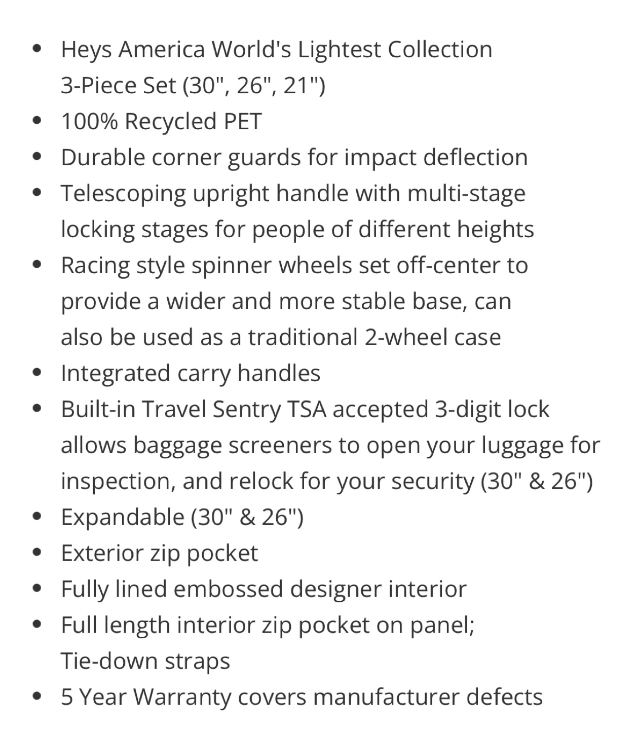 The set includes three sizes: 31", 26", and 21". The 30" weighs just 6.1 pounds and the carry on 21" just 4 pounds! These polyester fabric Heys Xero Elite luggage has racing style spinner wheels and a built-in TSA approved combination lock too. The two larger sizes can be expanded when you need more packing space