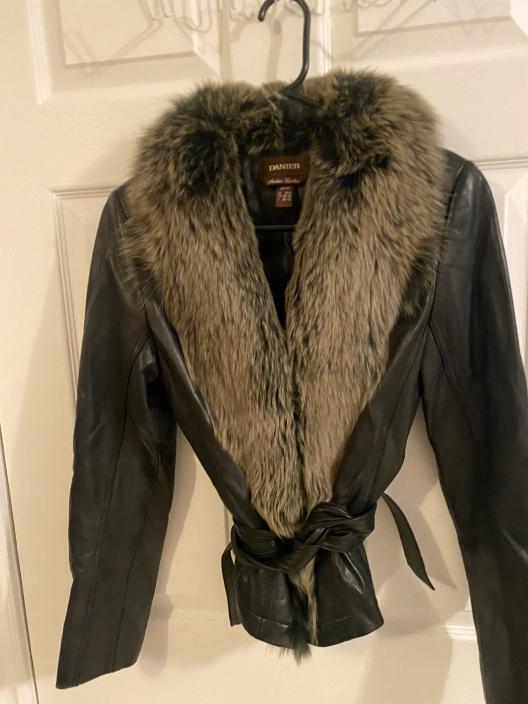 Selling a Danier Italian Leather jacket. It's a size XS but fits more like a Small and features a stylish fur collar and a tie around the waist. Perfect for adding a touch of elegance to your wardrobe!