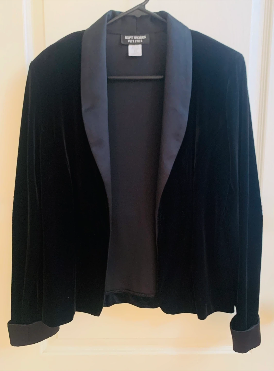 Selling a Vintage Soft Works Petites black velvet and satin blazer in size S/P. It's in great condition and made in Canada. Perfect for adding a touch of elegance to any outfit! From the 80s.