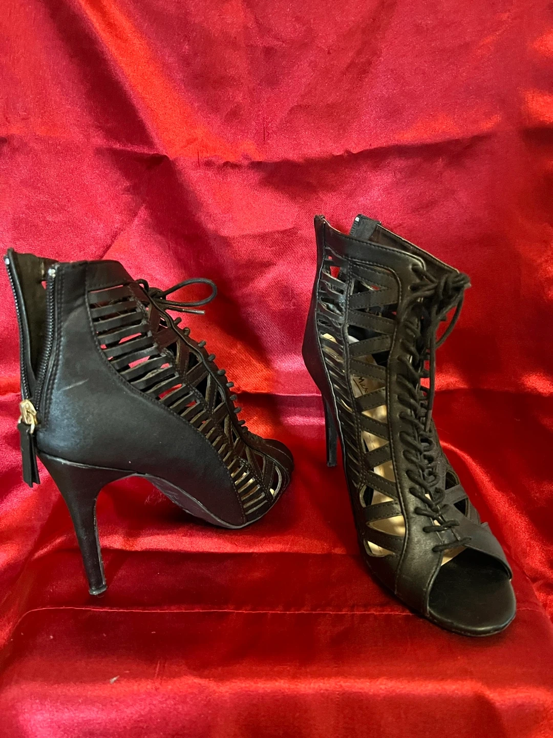 These are a pair of black lace-up heel booties. They have a stiletto heel and a cutout design. They appear to be in good condition.