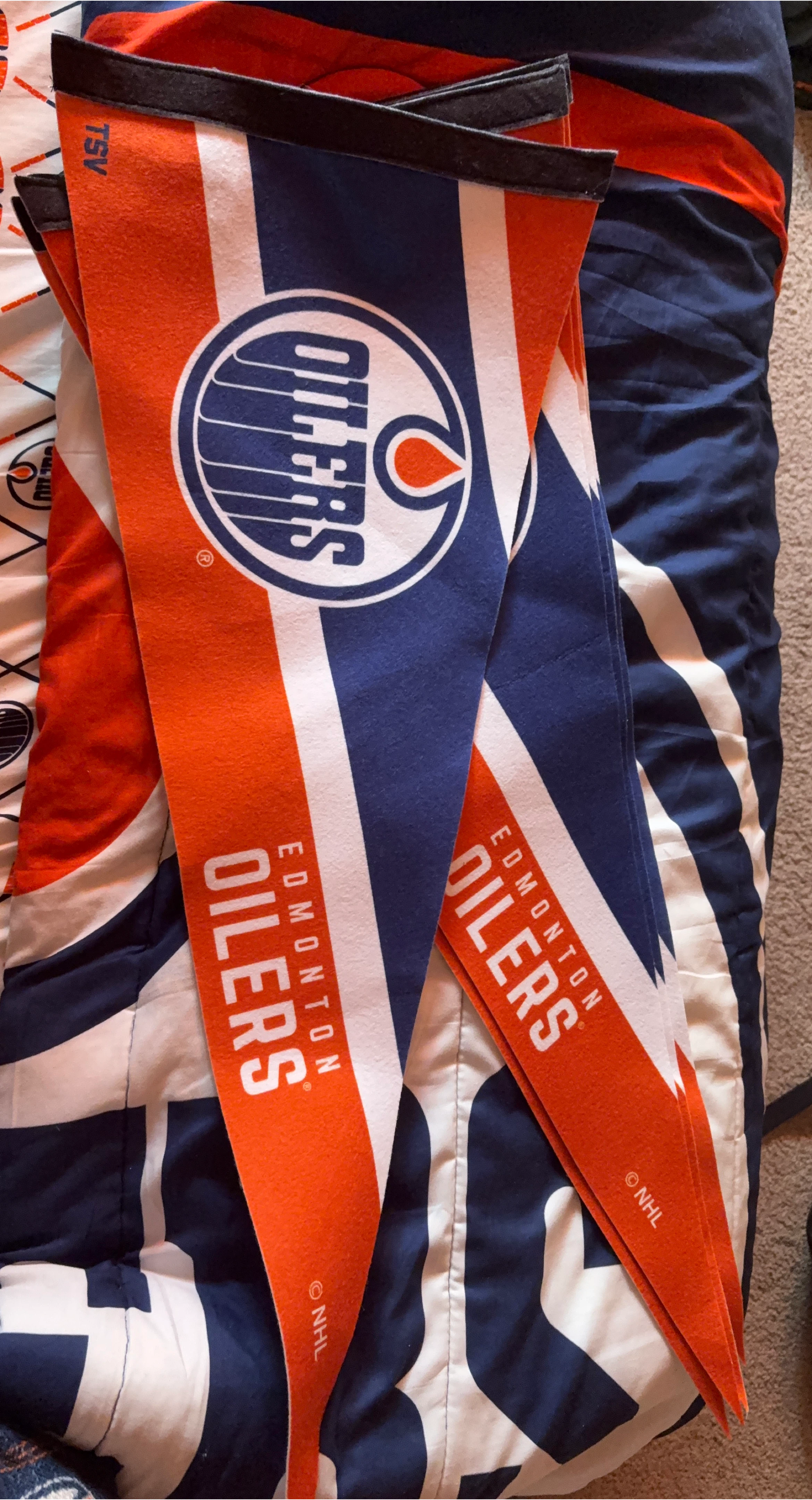 Selling a set of 5 Edmonton Oilers pennants! Perfect for showing your team spirit. They feature the classic Oilers colours and logo. Great for decorating your space or adding to your collection