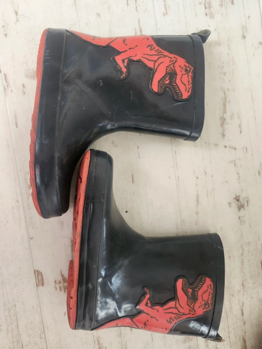 Selling a pair of rain boots with a cool dinosaur design! They're black with a red dinosaur on the side and red soles. Perfect for puddle jumping!