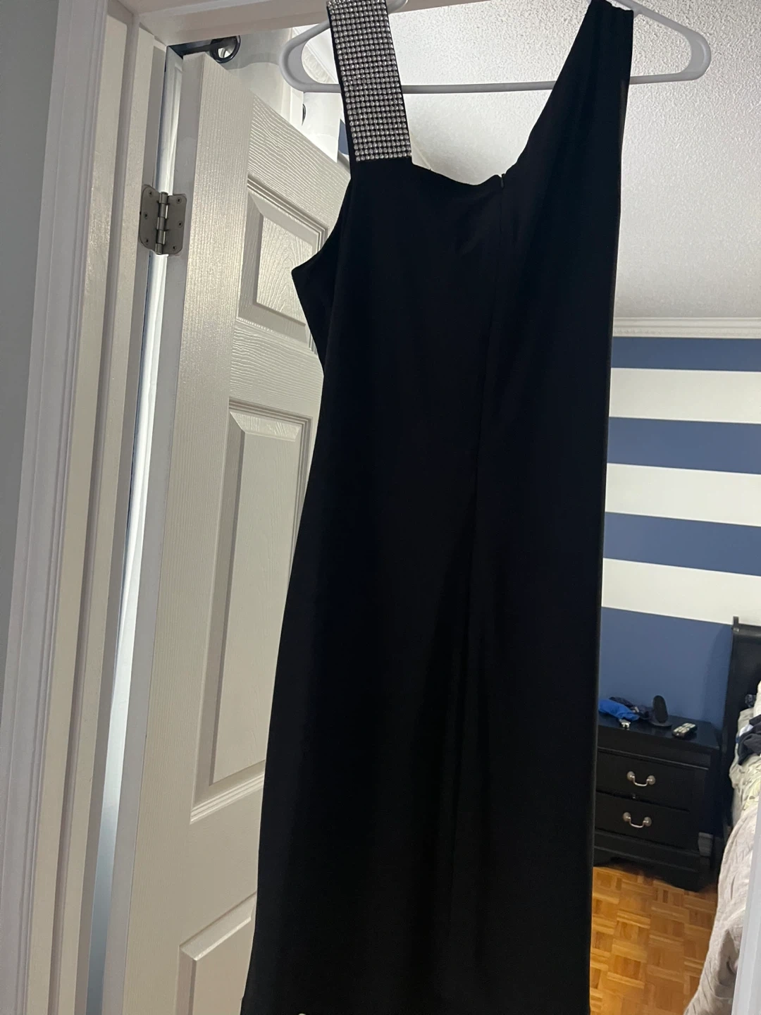 Selling a beautiful black dress from Le Chateau in size 14. It's in great condition and has a unique one-shoulder design with a sparkly detail. Perfect for a night out or special occasion!
