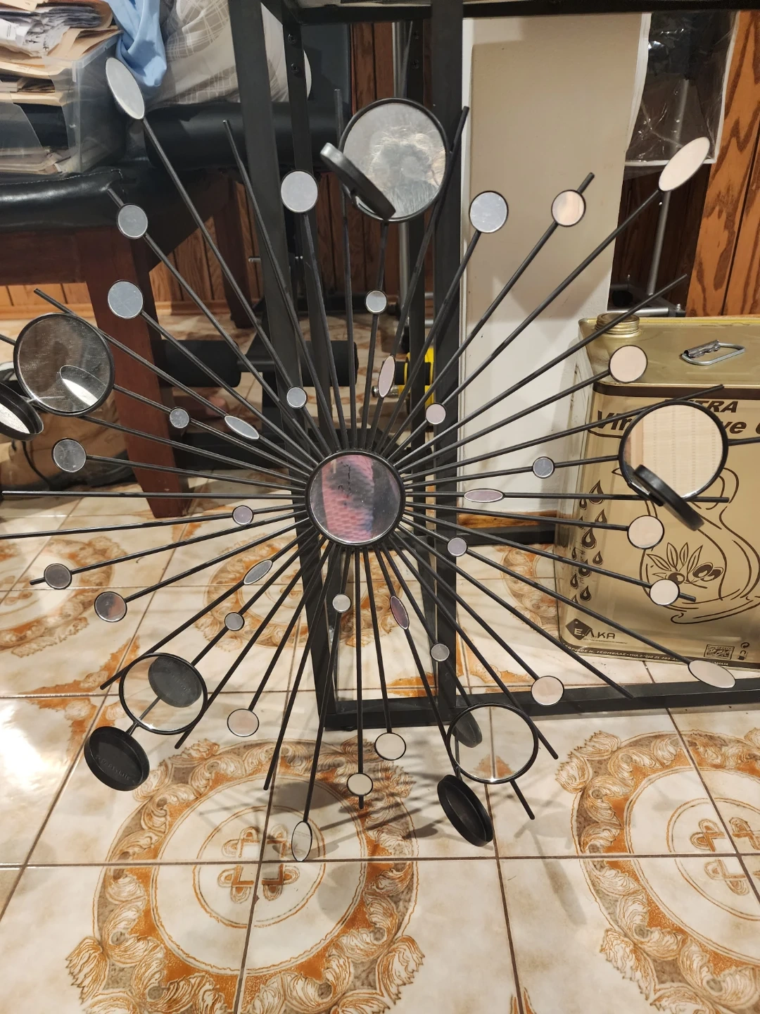 Unique starburst mirror wall decor! It's in great condition and would look amazing in any room. The design features a central mirror surrounded by radiating rods with small circular mirrors attached, creating a cool, eye-catching effect