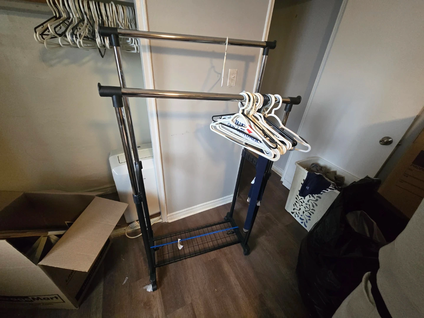 I'm selling an adjustable double rod clothing rack! It's perfect for adding extra hanging space in your closet or laundry room. It's in great shape and ready for a new home