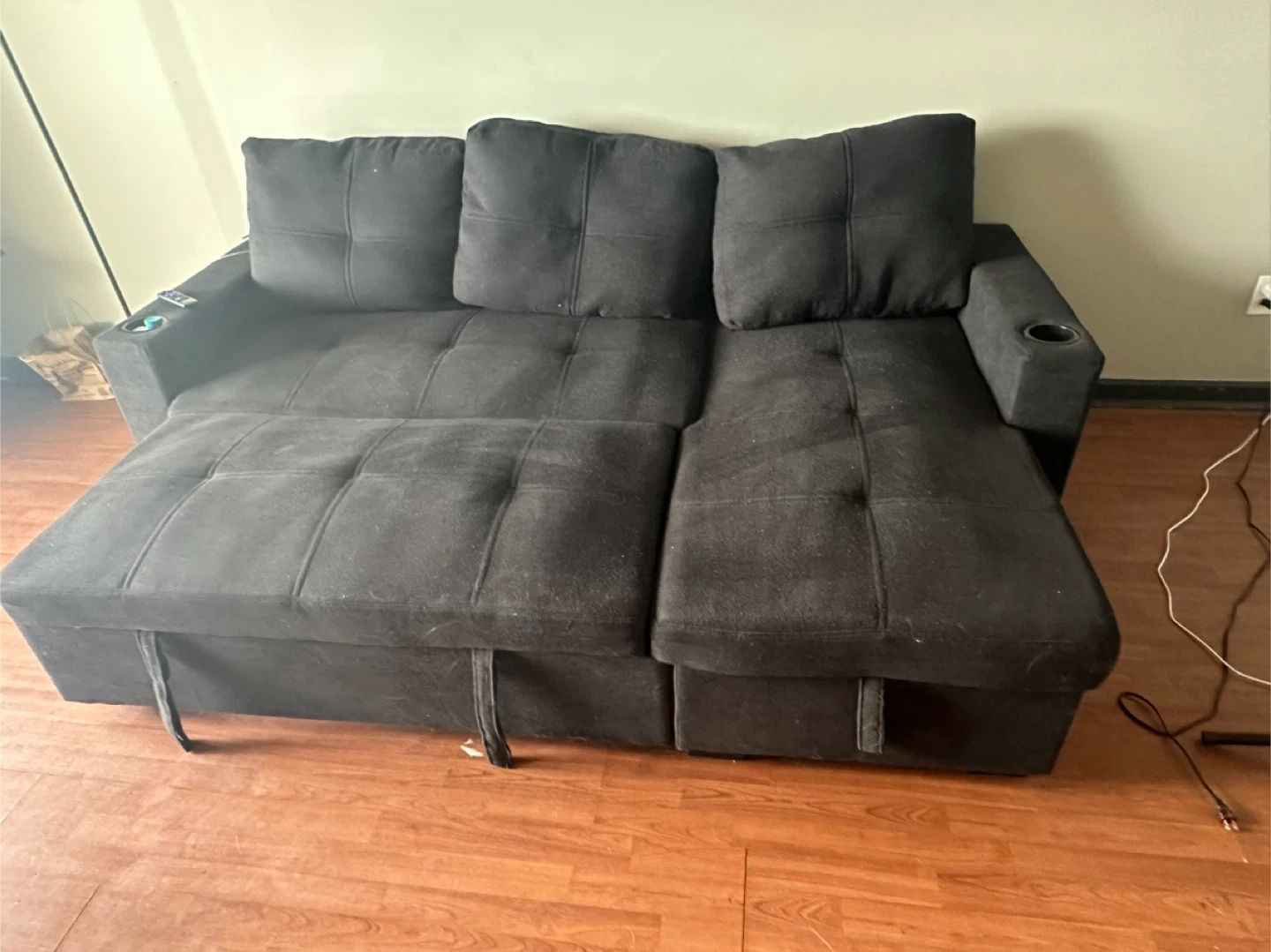 Selling a comfortable black sectional sofa! It features a convenient pull-out bed, perfect for guests or extra sleeping space. It also has built-in cup holders on both sides. A great addition to any living room!