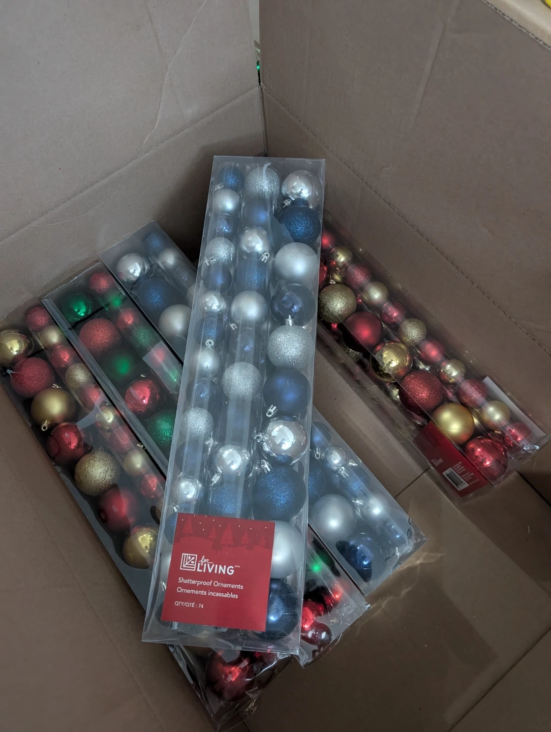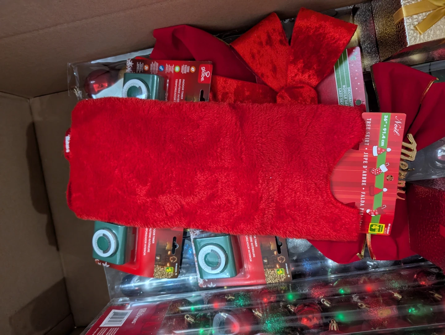 Selling a variety of new Christmas decorations! Includes a festive red wreath with snowflake accents, brand new in package shatterproof ornaments in various colours, a red tree skirt, indoor timers, and more!