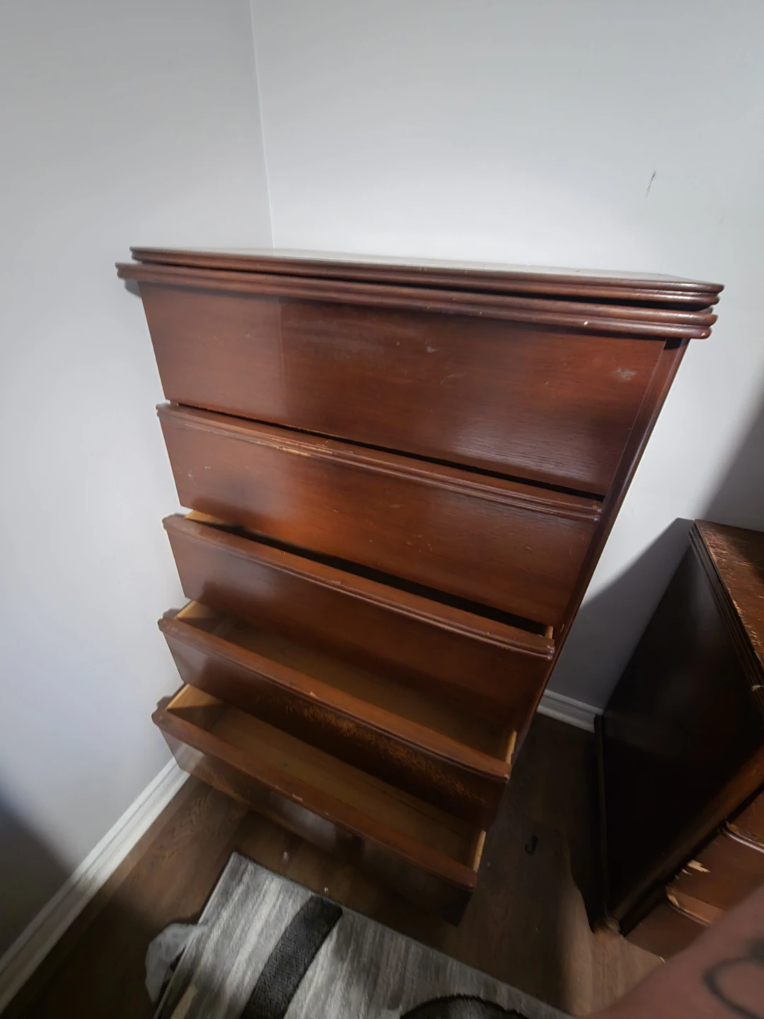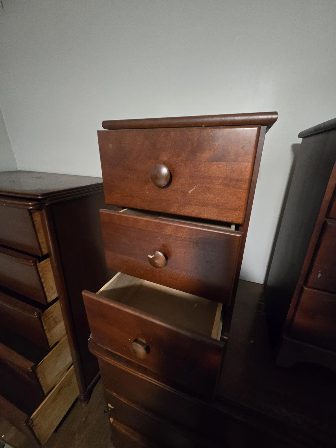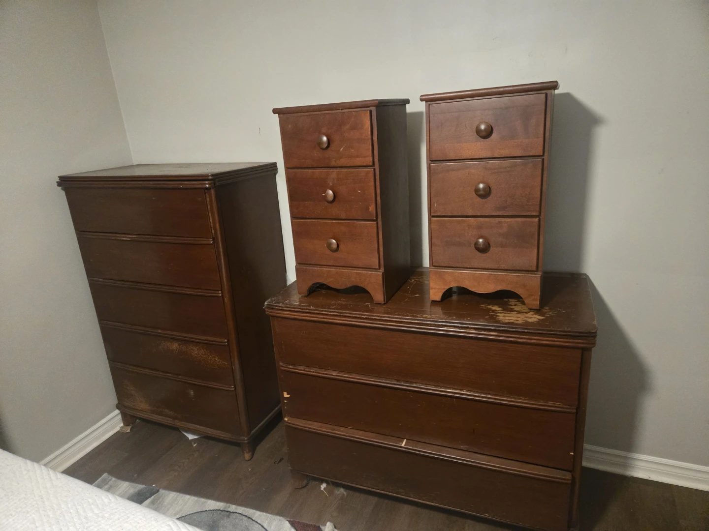 Selling a set of wooden dressers. They show some signs of wear and tear, as seen in the photos. Perfect for a DIY project or for someone looking for affordable storage solutions
