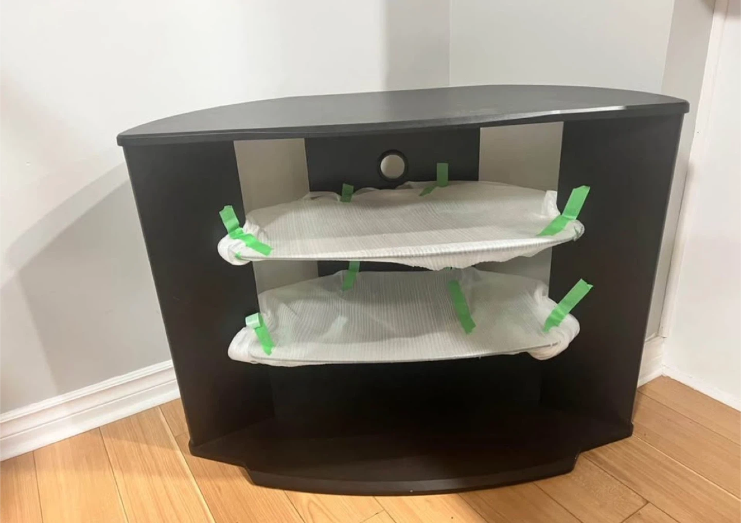 Selling a black corner TV stand in great condition! It has two shelves for storage and fits nicely in a corner to save space. Perfect for a small living room or bedroom