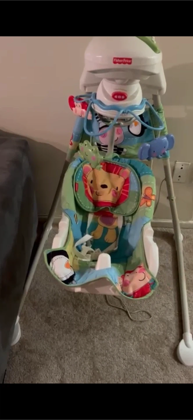 Fisher-Price baby swing in good condition! It has a cute design with Winnie the Pooh and other animals. Perfect for keeping your little one entertained and comfortable