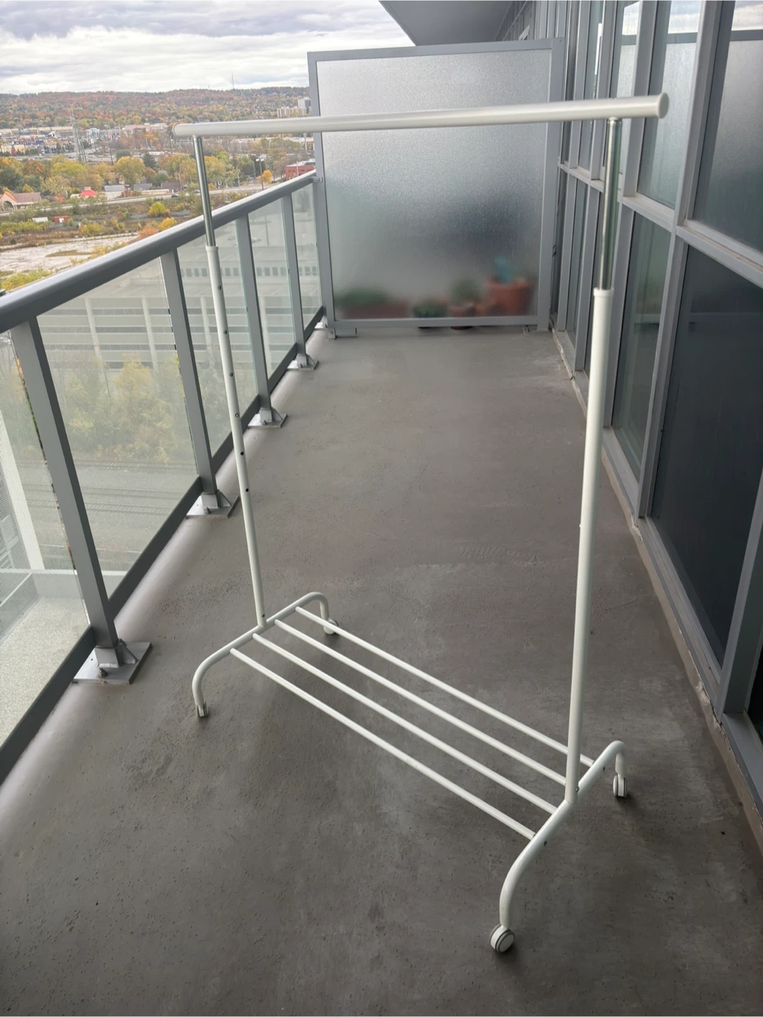 Selling a clothes rack in great condition! It's white and has a simple design with a hanging bar and a bottom rack for shoes or storage boxes. Perfect for adding extra hanging space to your closet or bedroom