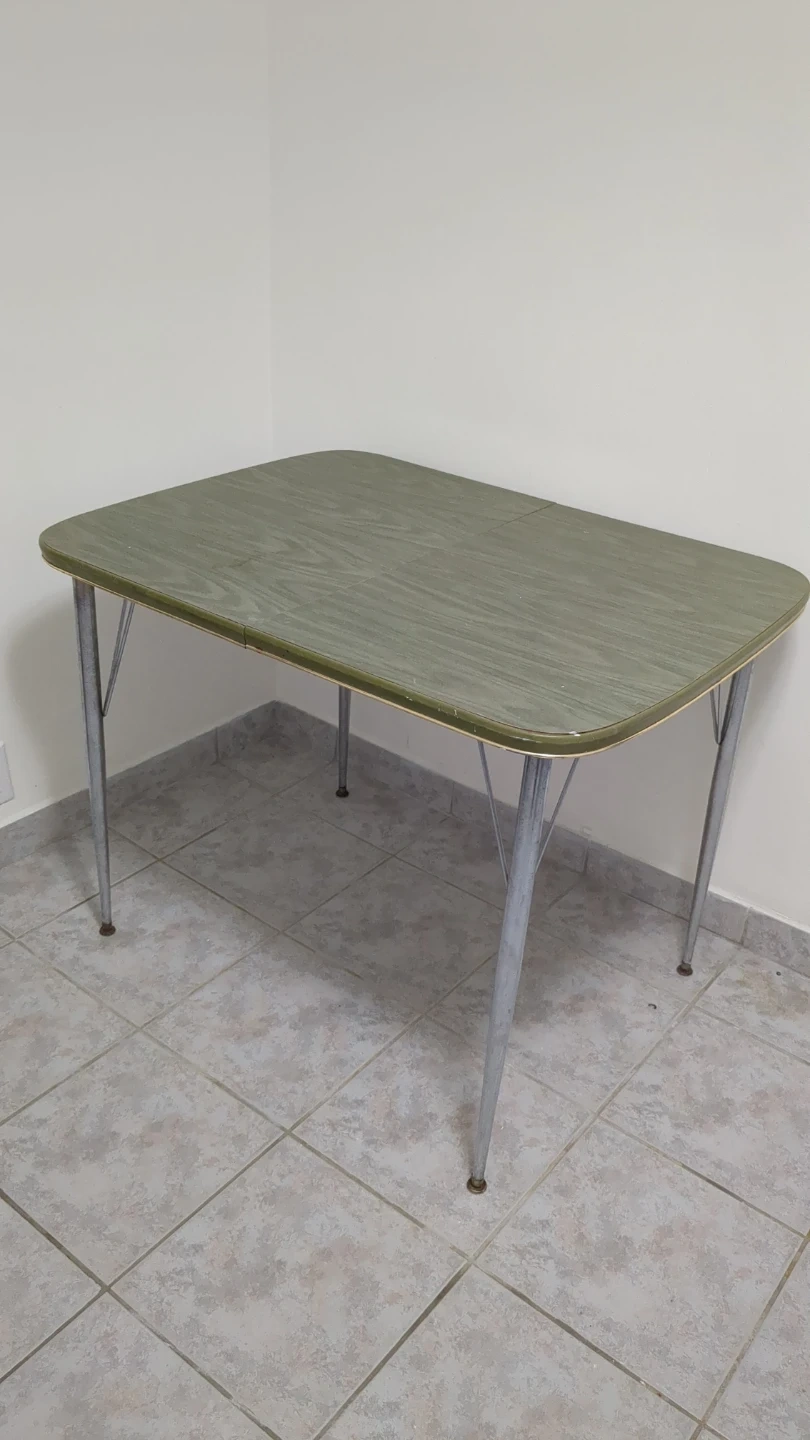 Selling a vintage dining table with a unique green top and silver legs. It's in good condition and would be a great addition to any home! The table has a retro look and feel