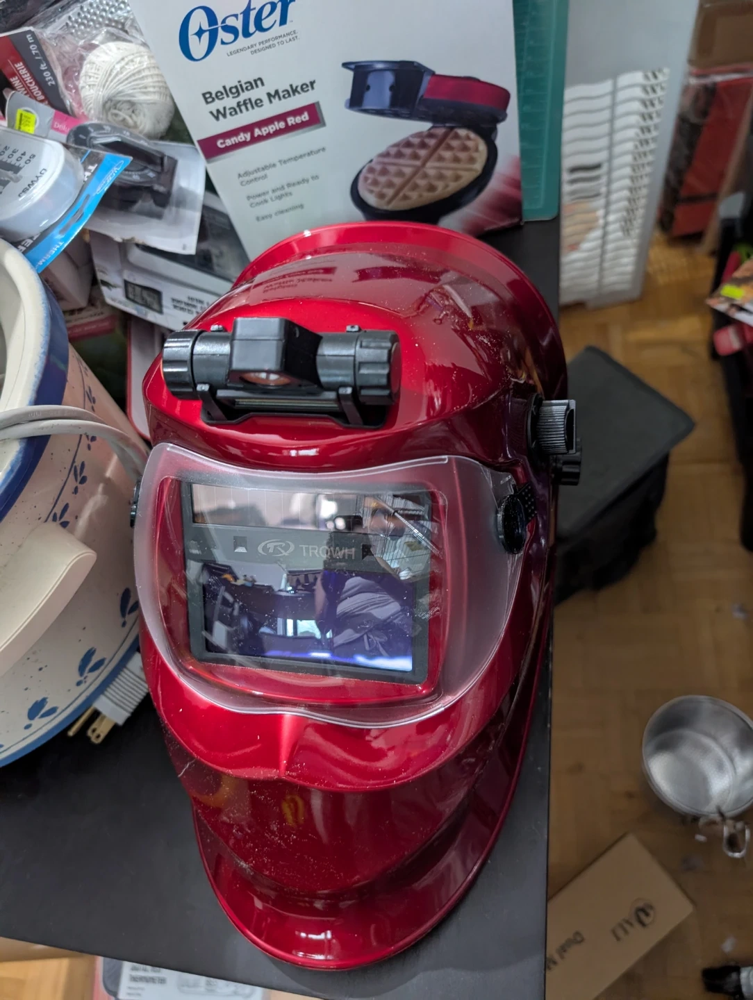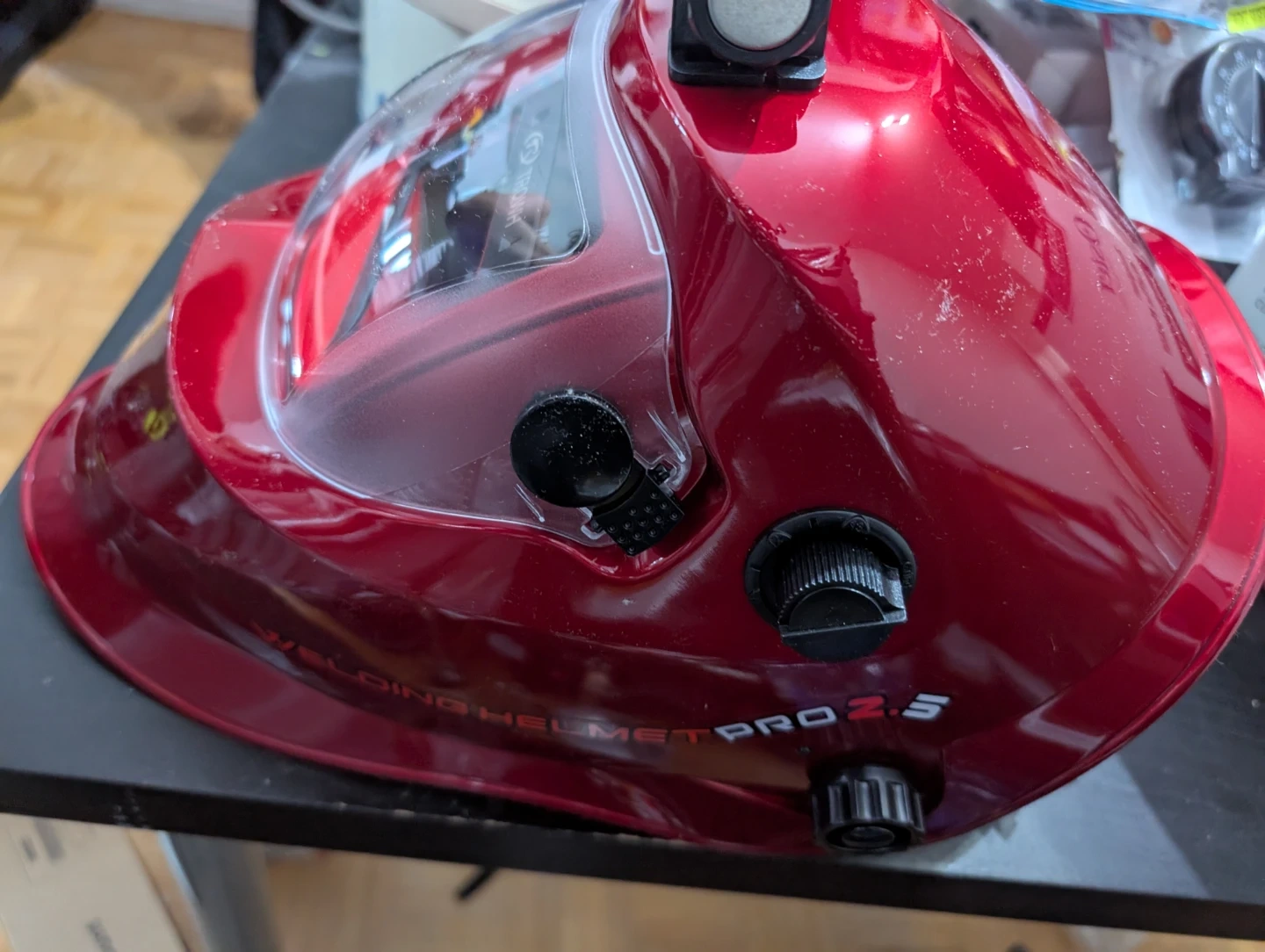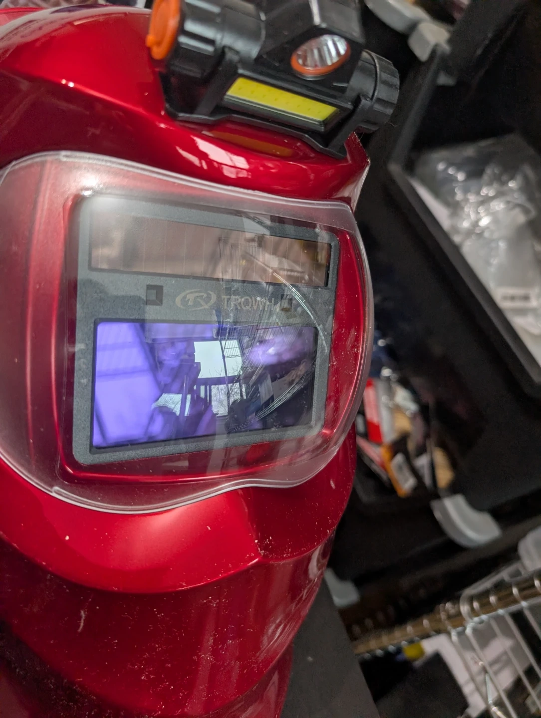 Selling a brand new red auto-darkening welding helmet, model PRO 2.5. It comes with the owner's manual.