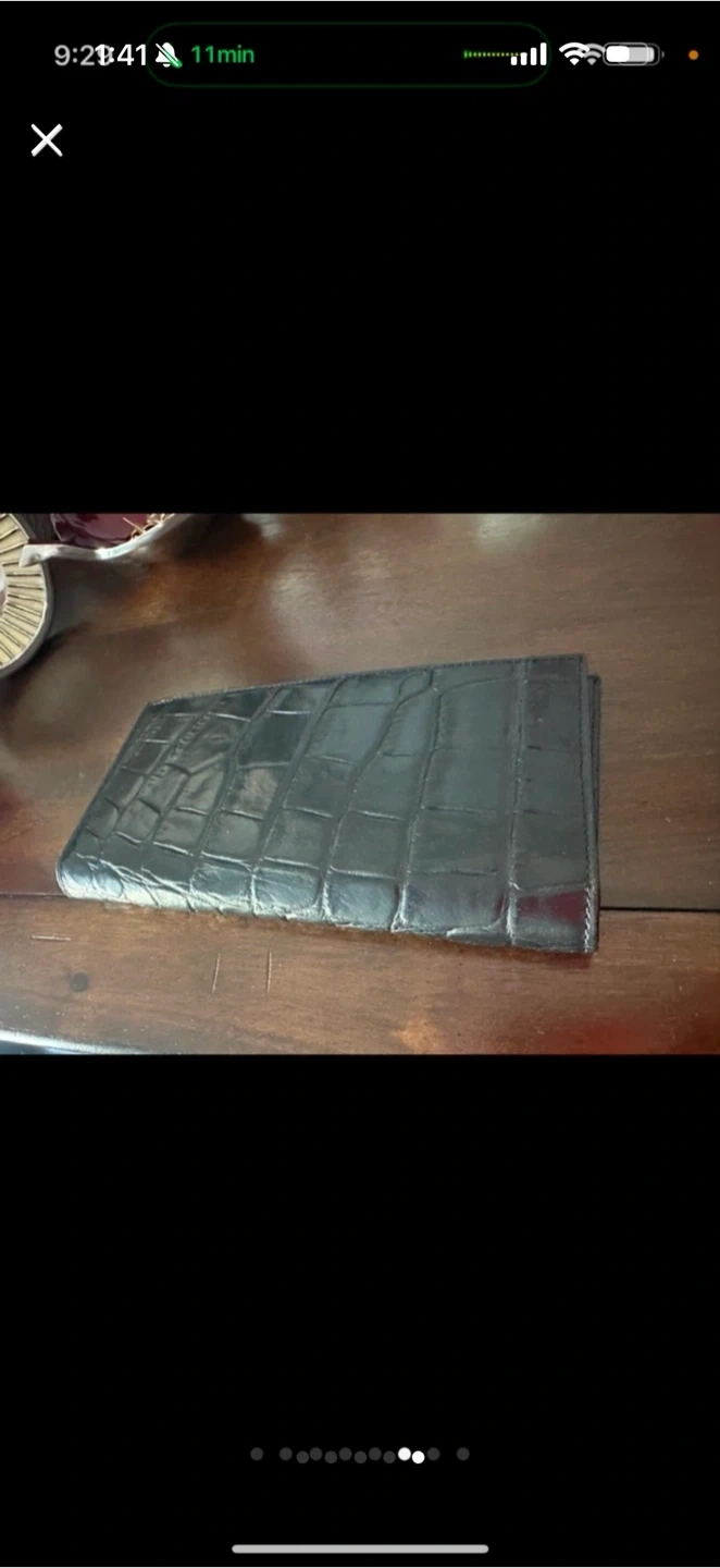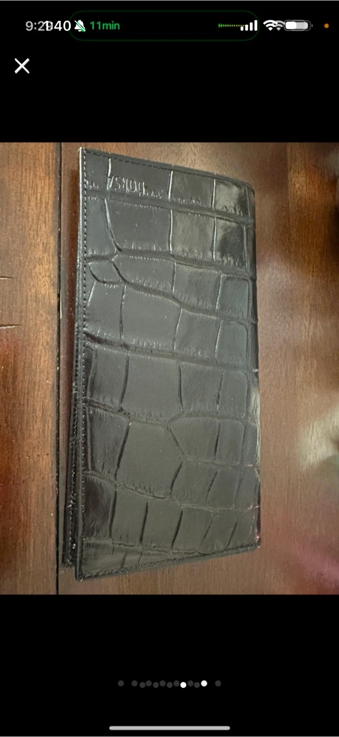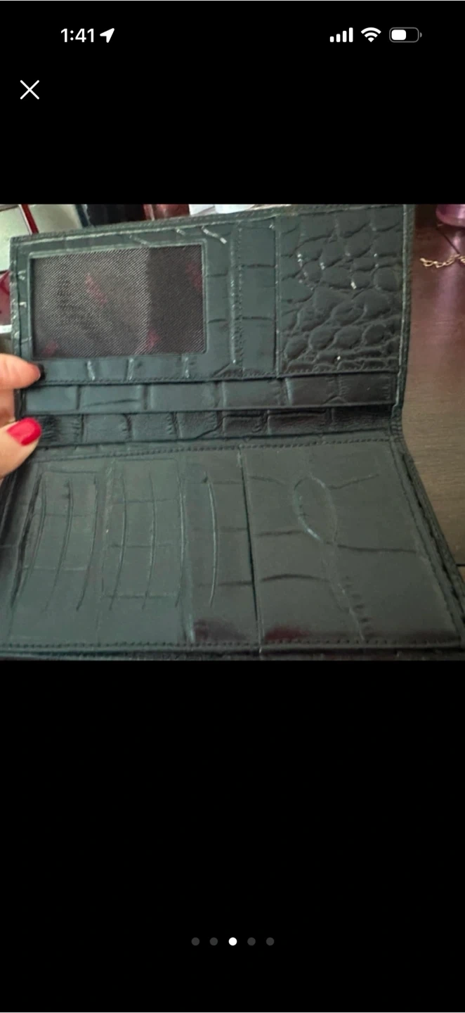 Selling a black leather wallet. It has a crocodile-like pattern on the exterior. The interior has several compartments for cards and cash. It's in good condition!