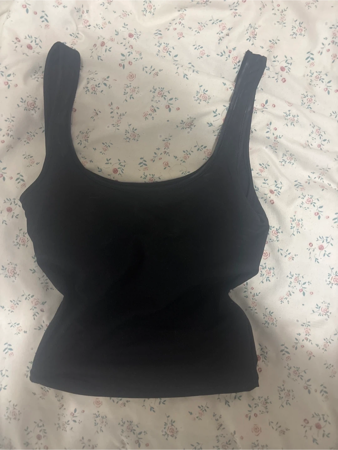 A simple black tank top, perfect for layering or wearing on its own. It has a flattering cut-out design on the sides. It's in great condition and ready for a new home! Needs a wash only
