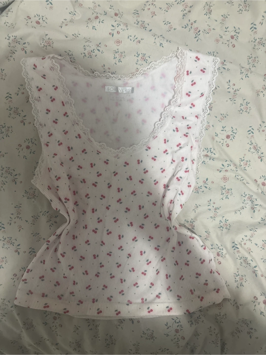 Super cute Forever 21 tank top with a cherry print and lace trim! It's in great condition