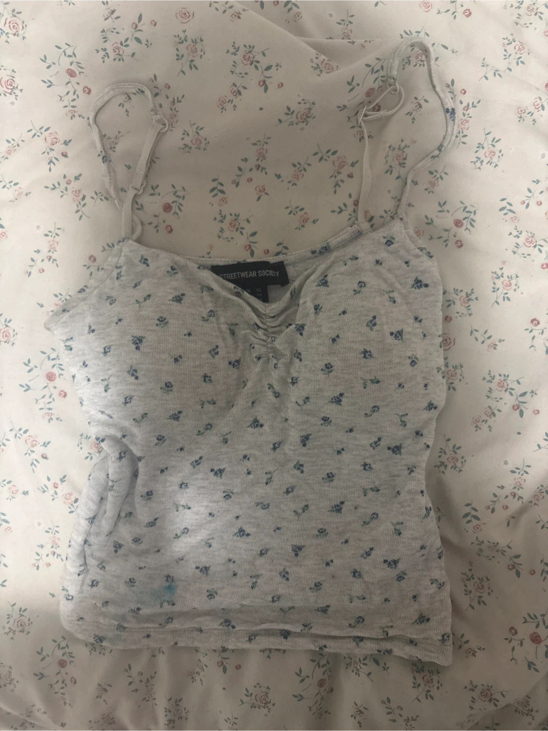 Selling a cute tank top from Streetwear Society! It's a size XS and has a lovely floral pattern. There is a small stain on the bottom.