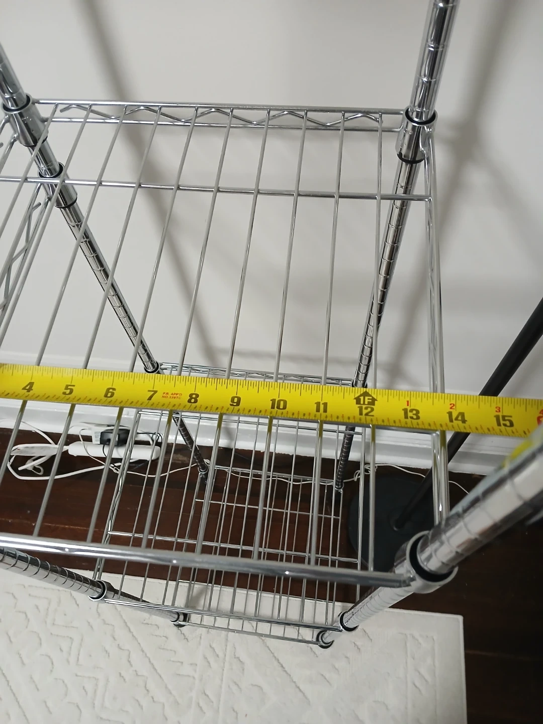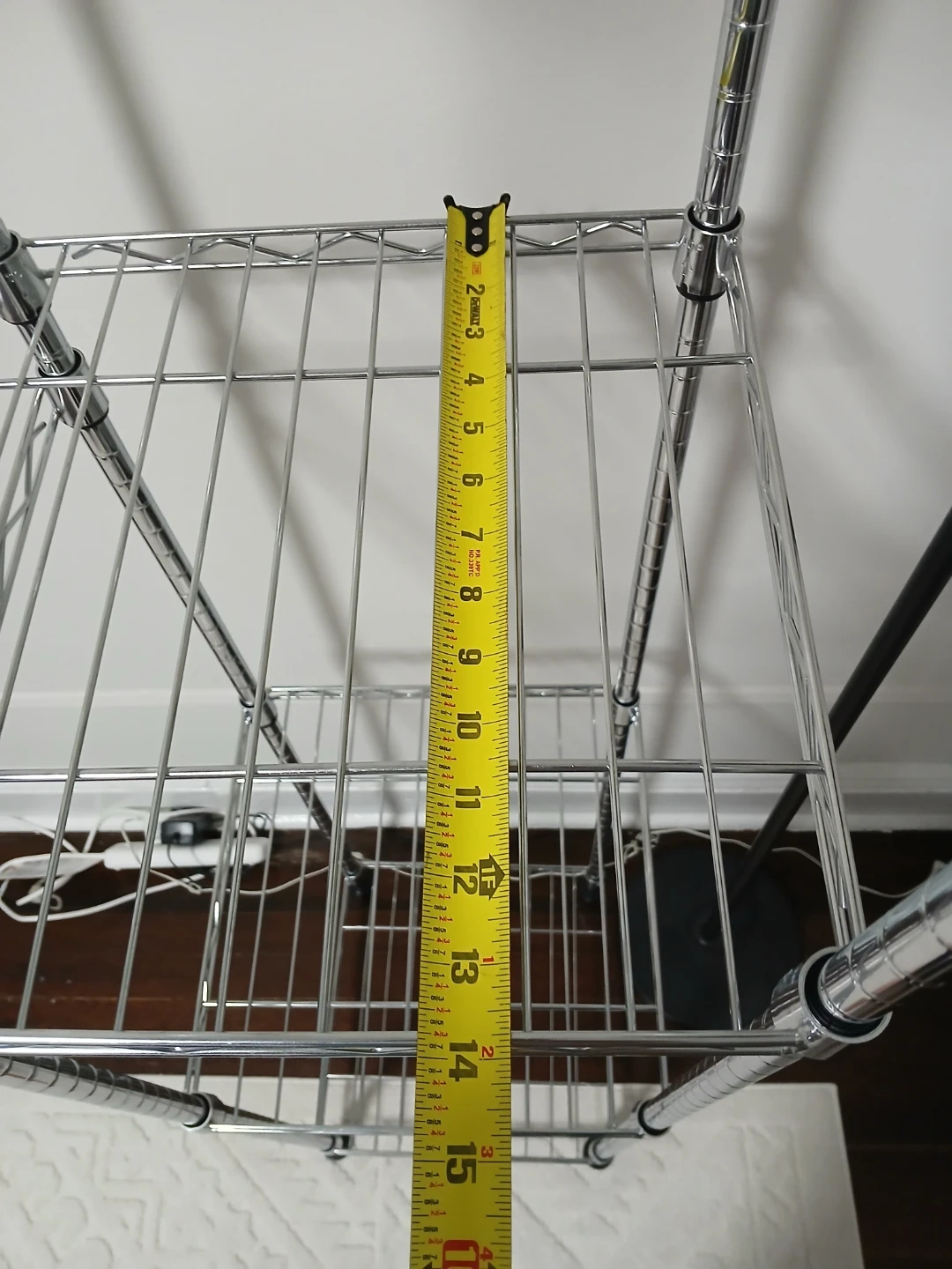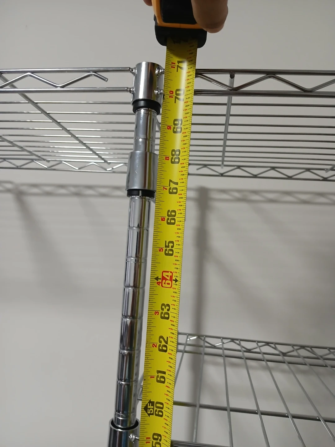 Selling a chrome Amazon Basics hanging storage organizer. It's in great shape and ready to help you get your closet organized! The dimensions are approximately 57-80 x 14 x 72 inches. It features adjustable wire shelves that can move up or down in 1-inch increments. Durable steel construction with adjustable leveling feet