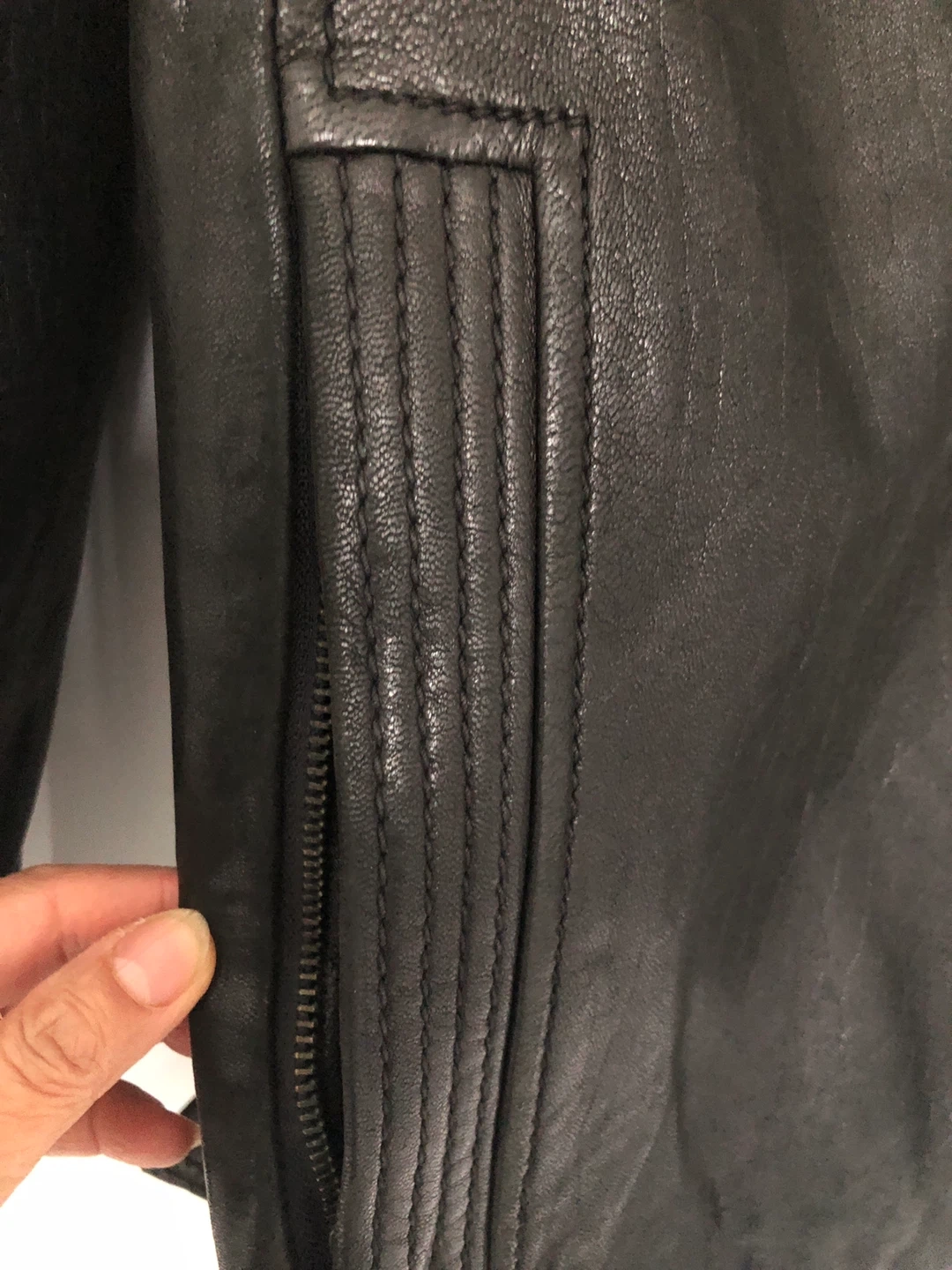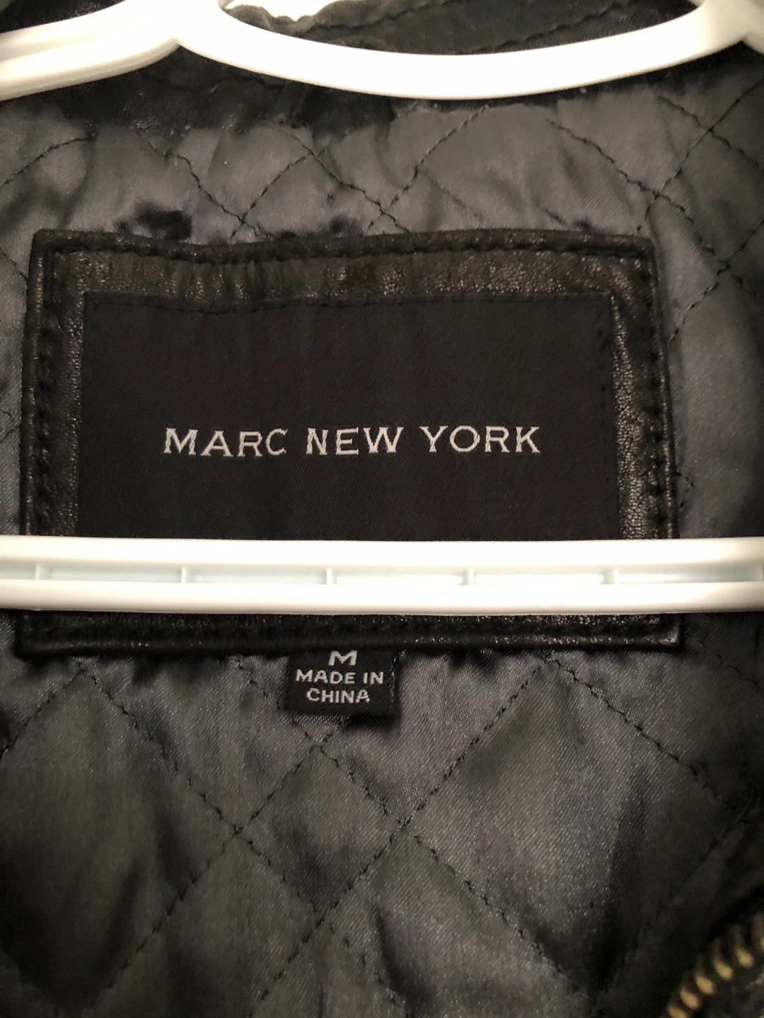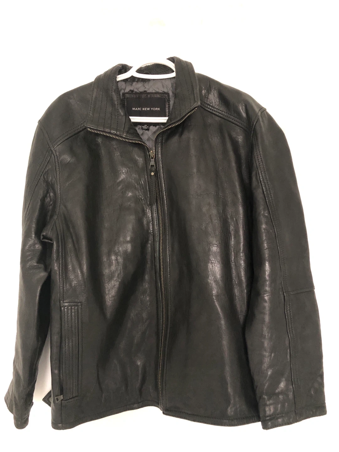 Here's a stylish black leather jacket from Marc New York in excellent condition. It's a size medium and features a quilted lining for extra warmth and comfort. It has zippered pockets and an extra pocket with Velcro inside to keep valuables/ wallet ( 2nd last pic.) It has 2 size options at the bottom. (last pic). Check out my other postings, Combo deals and great discounts when purchasing 2 or more items.