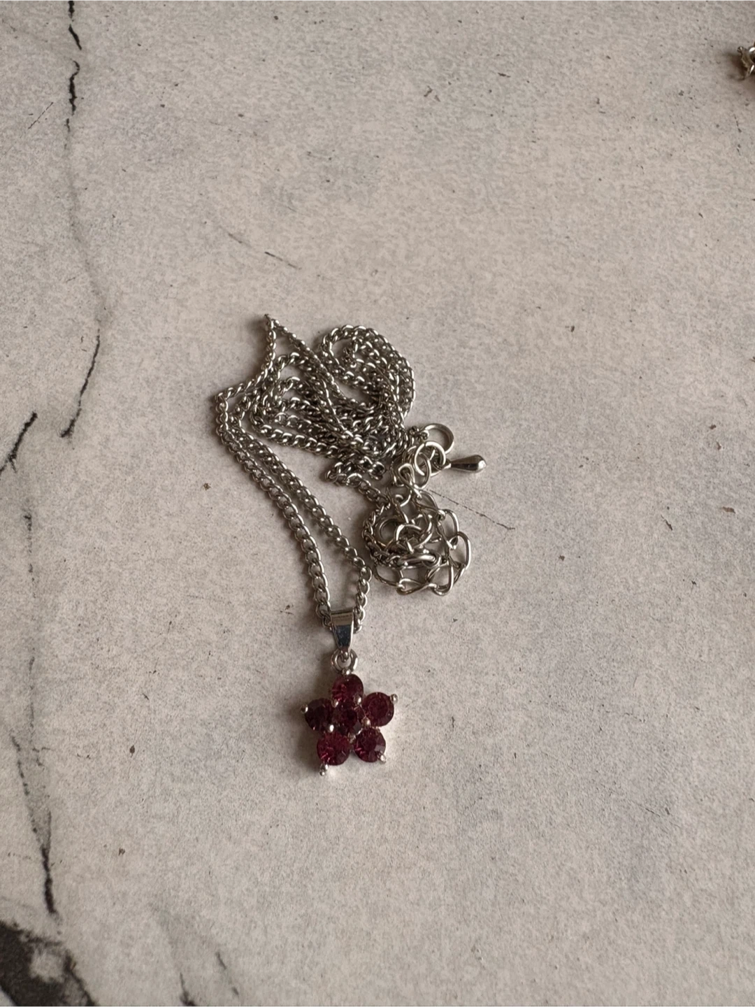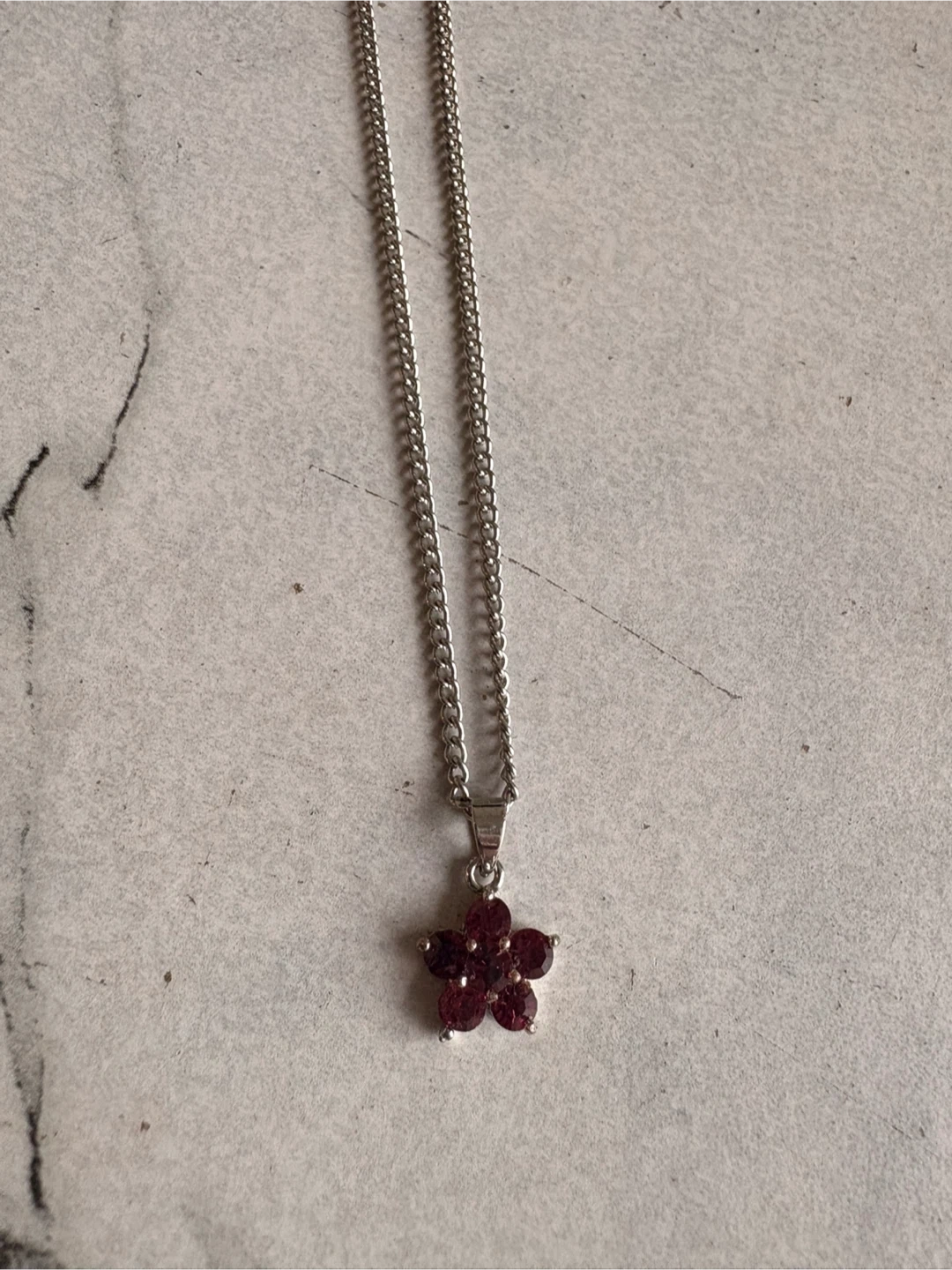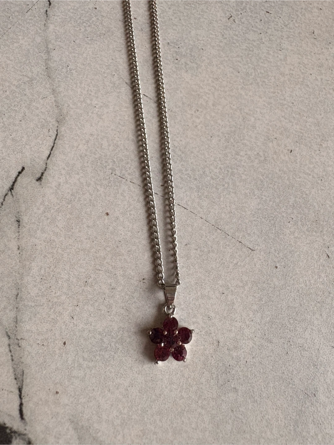 This is a cute silver necklace with Ruby flower pendant. The flower has red/burgundy stones. It's in great condition and ready to add a bit of sparkle to your day