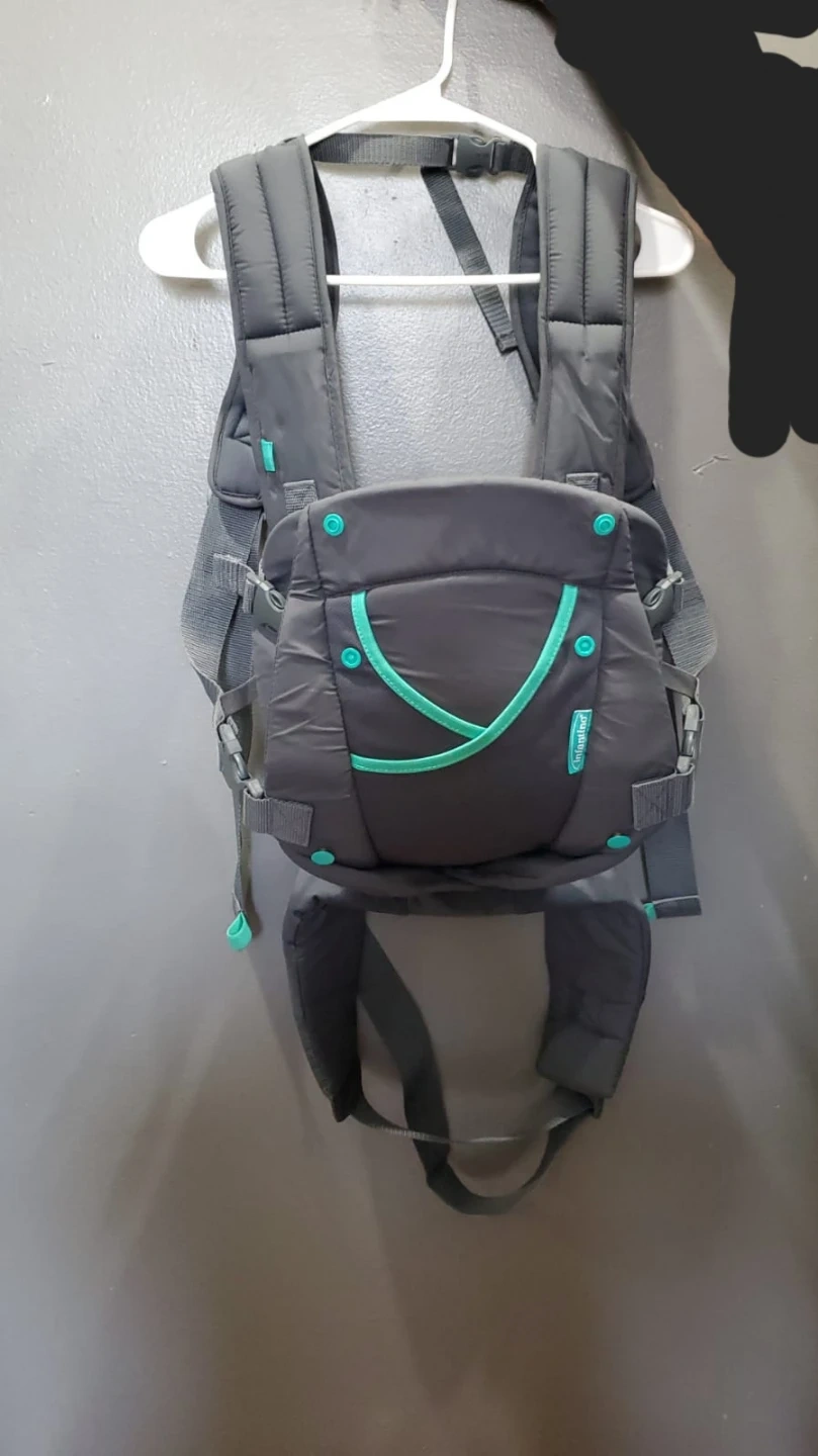 I'm selling an Infantino carrier in great condition! It's a stylish gray with teal accents. This carrier is perfect for keeping your little one close and comfortable while you're on the go