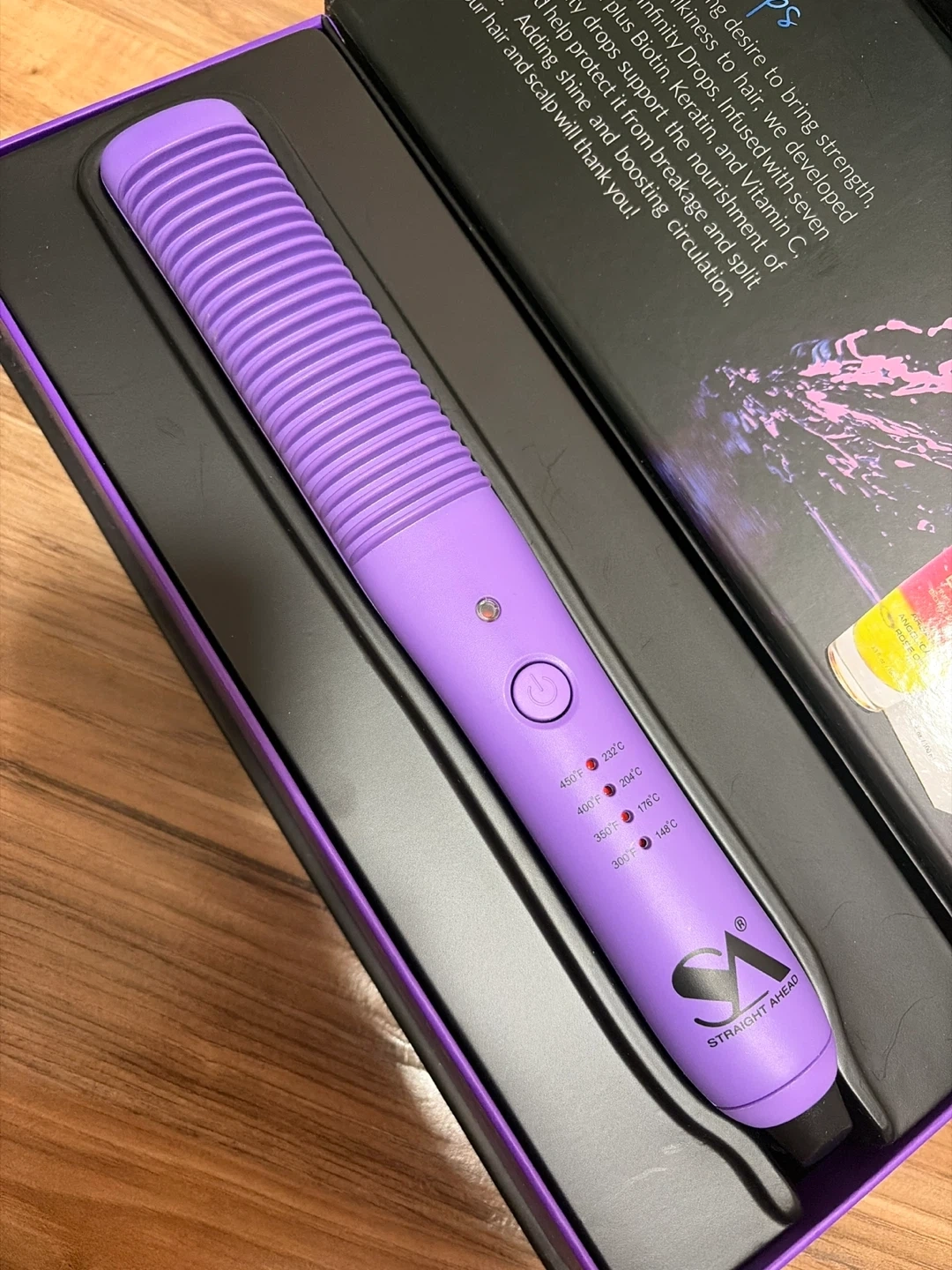 Selling a Straight Ahead Pro Glider 1.0 hair straightening brush in excellent condition! It comes with its original box and all components. This brush is designed to bring strength and thickness to your hair, infused with seven Infinity Drops, Biotin, Keratin, and Vitamin C. It helps protect from breakage and split ends while adding shine and boosting circulation. Great for achieving sleek, straight hair with ease!