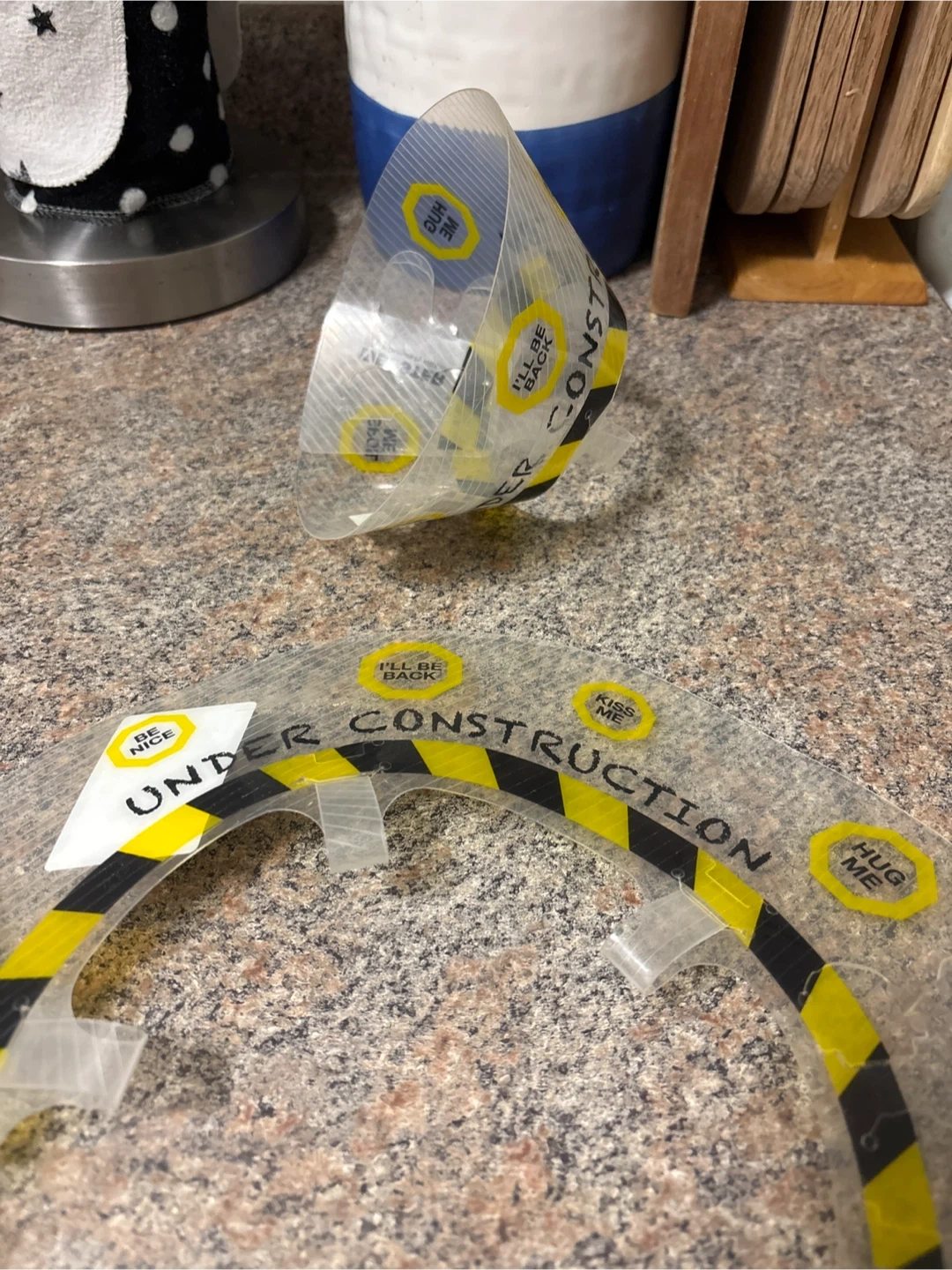 Selling 2 Buster Under Construction collar in size 7.5 cm. It's in great shape and ready to help your furry friend recover in style! The collar features a fun 'Under Construction' design with yellow and black stripes and cute little stickers.