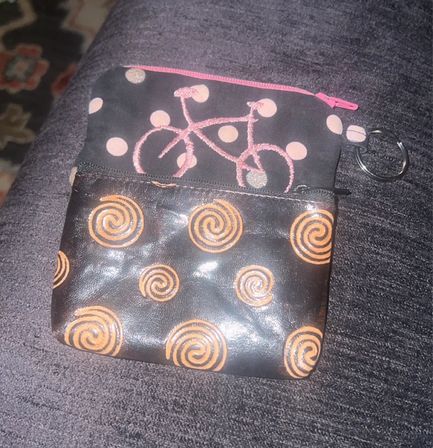 Here are two cute coin purses! One is black with orange swirl designs, and the other is black with pink polka dots and a pink bicycle design.