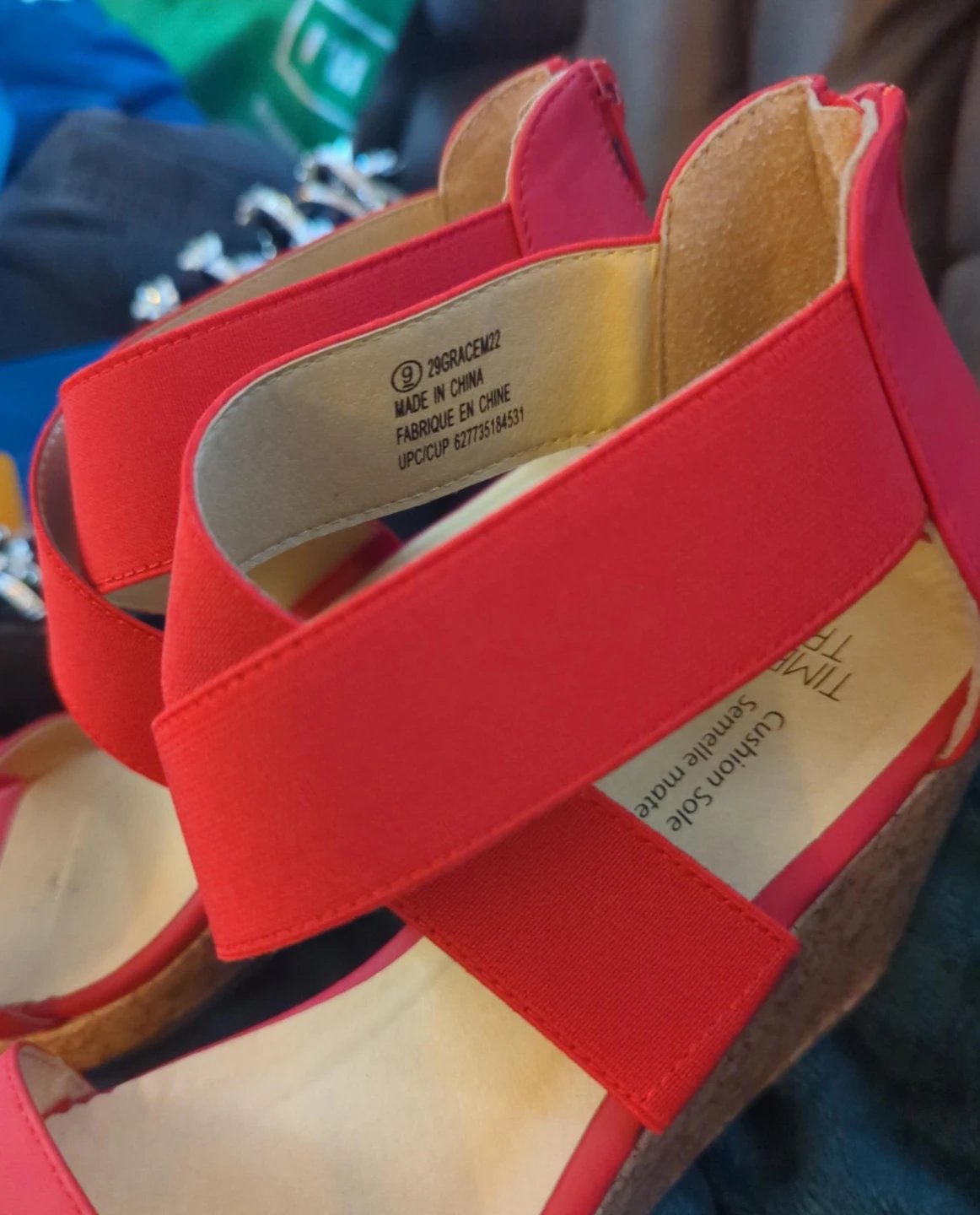 Selling a pair of Time true red wedge sandals in size 9. These sandals feature a cushion sole for extra comfort. Made in China.