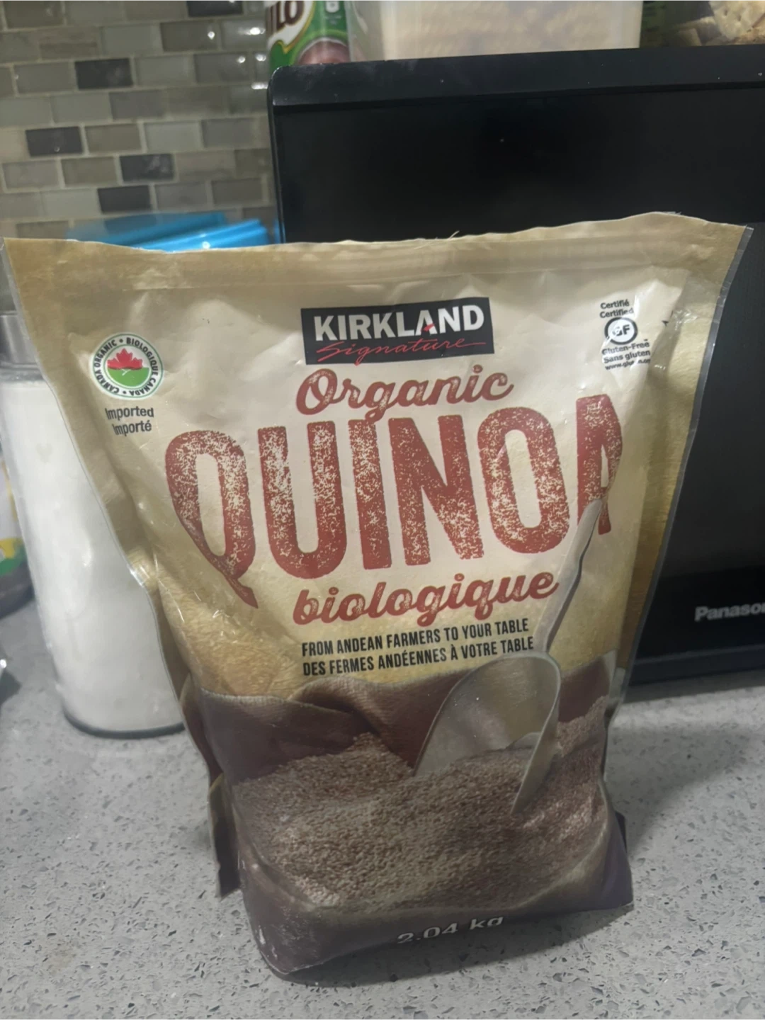 Selling a bag of Kirkland Signature Organic Quinoa! It's a 2.04 kg bag, perfect for stocking up your pantry. This quinoa is imported and certified gluten-free. From Andean farmers to your table!